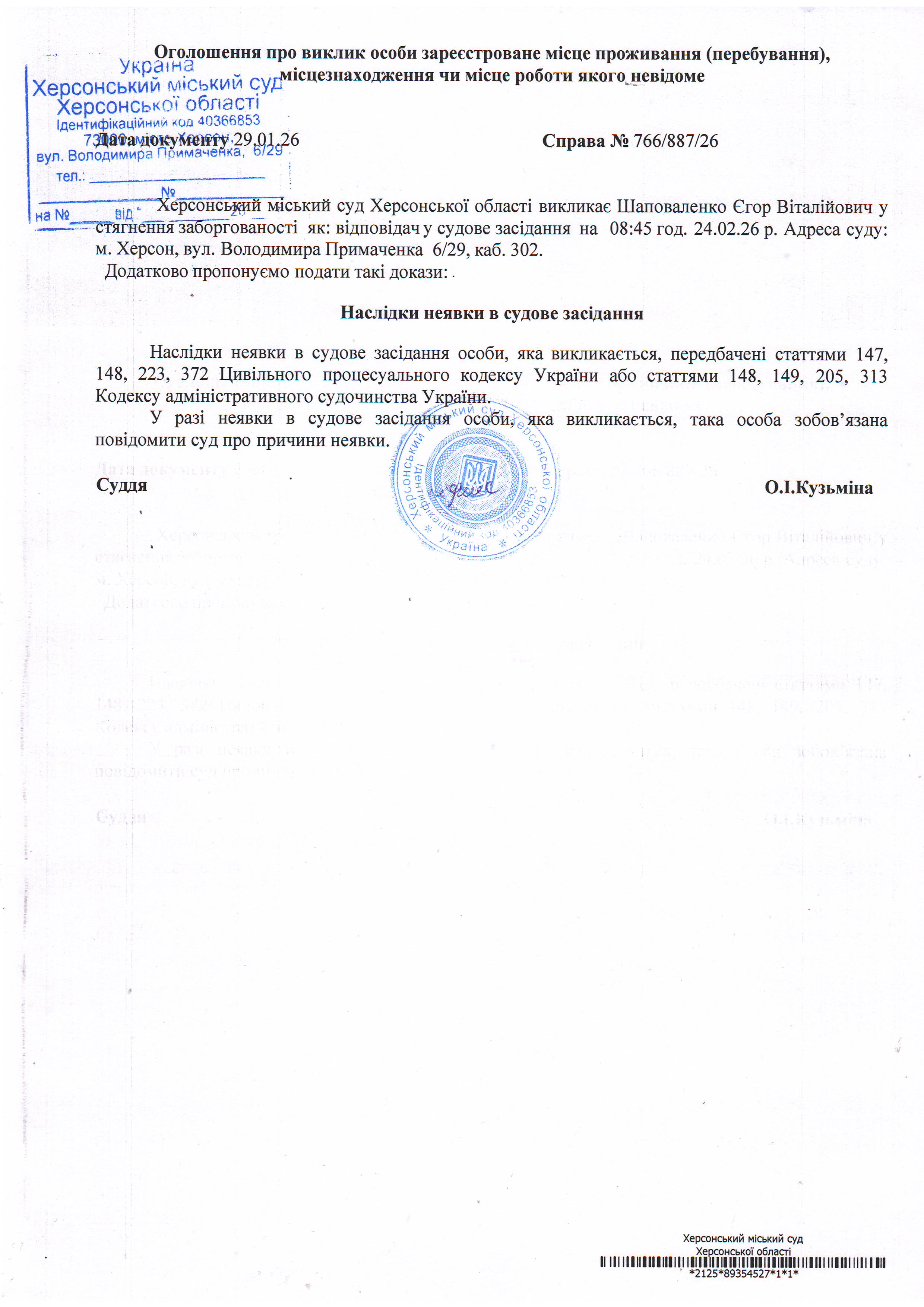 ОГОЛОШЕННЯ ПРО ВИКЛИК ДО СУДУ