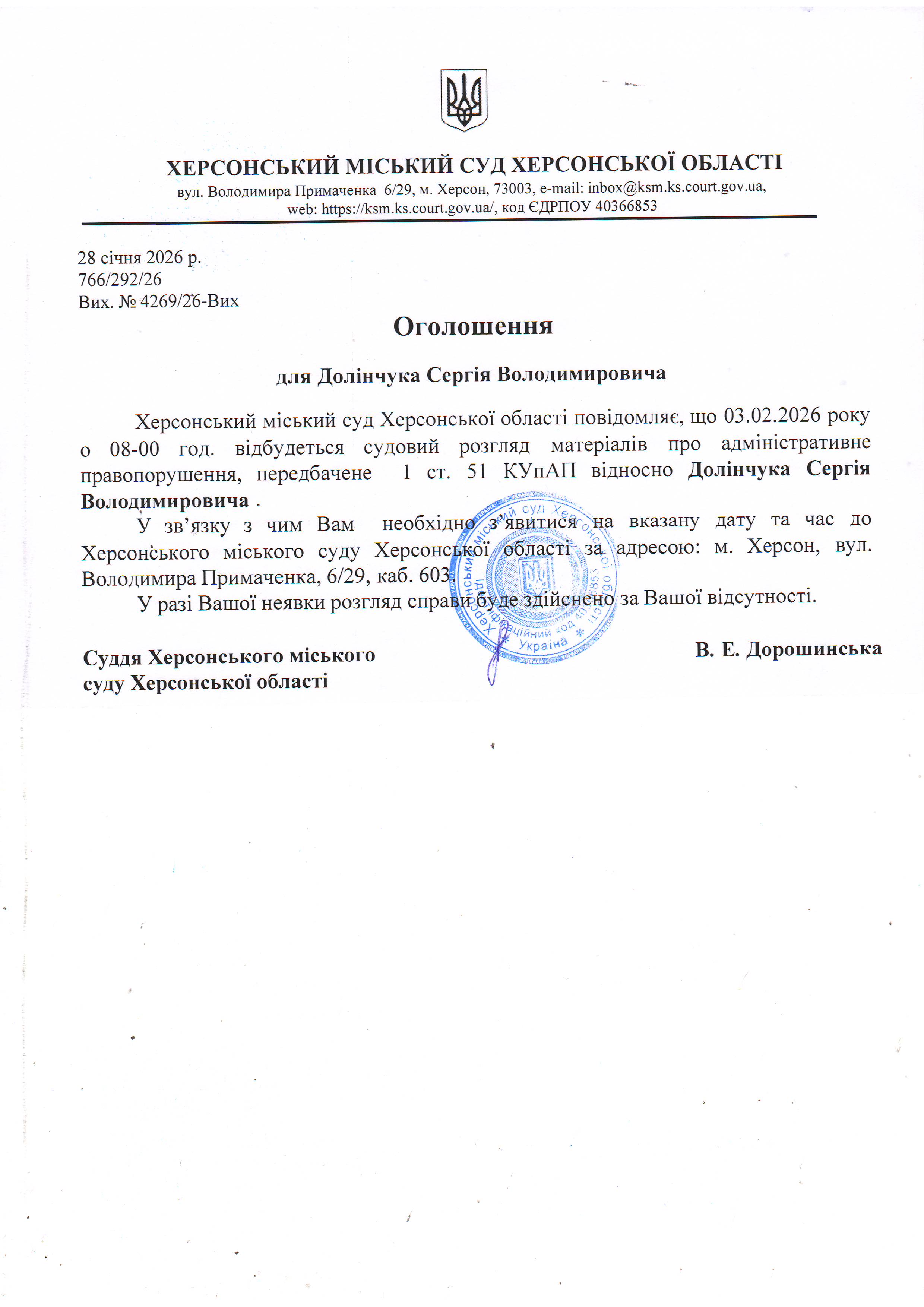 Оголошення для Долінчука Сергія Володимировича