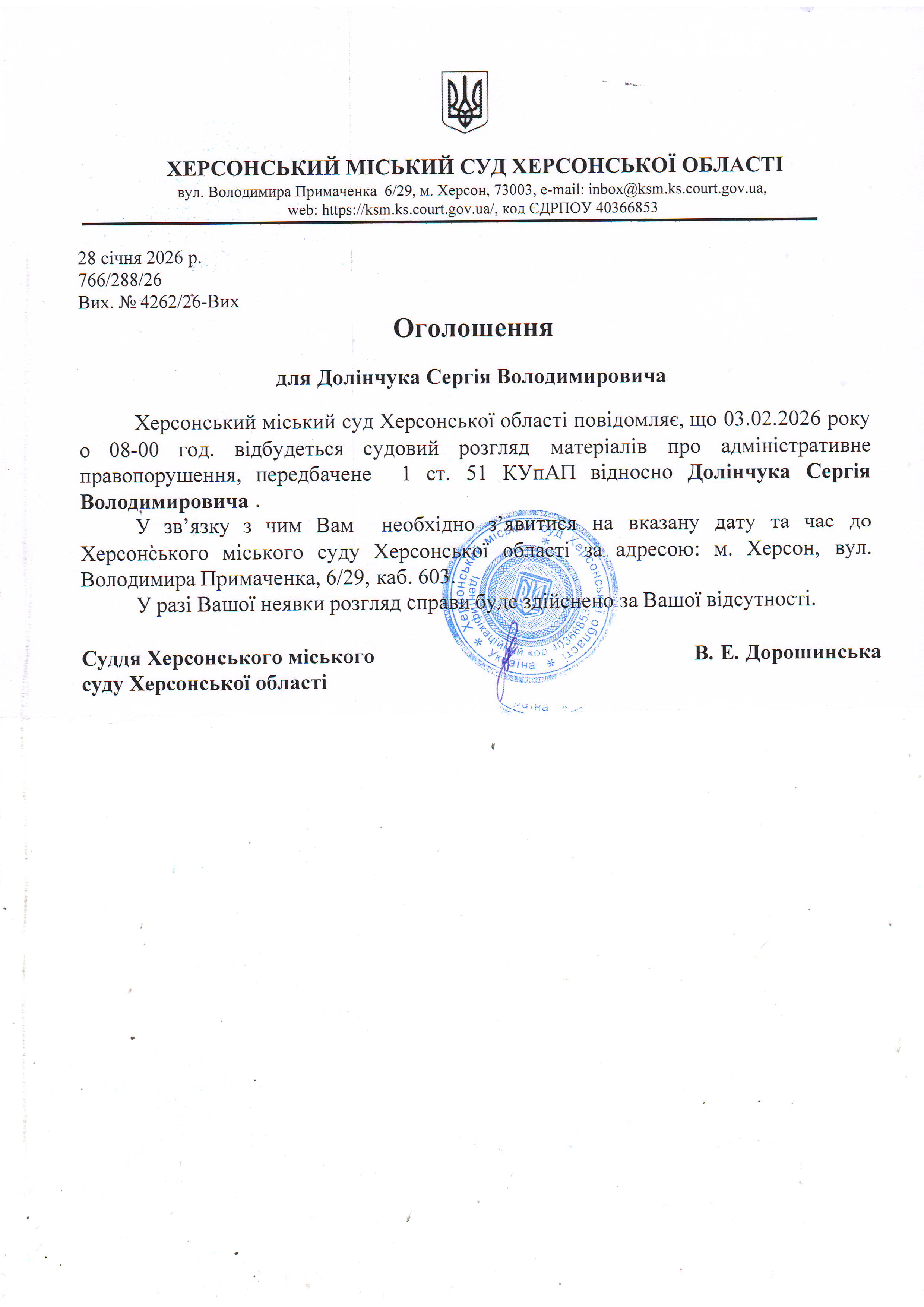 Оголошення для Долінчука Сергія Володимировича