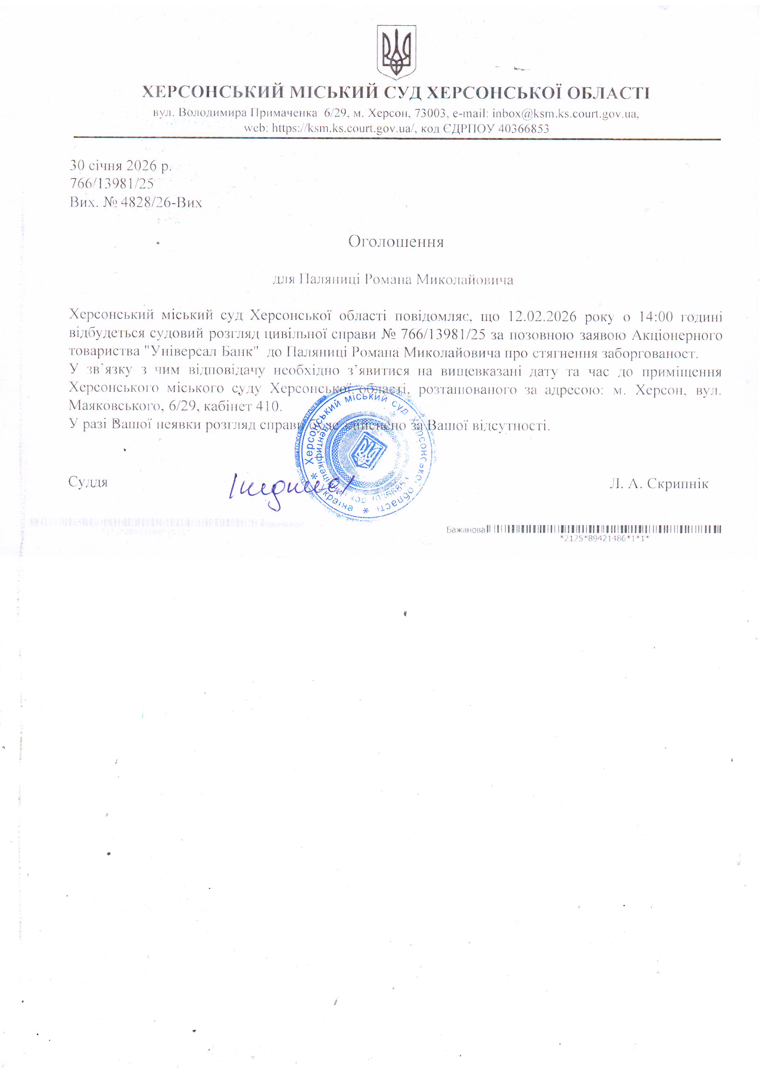 Оголошення про виклик особи в суд та повідомлення про судове рішення