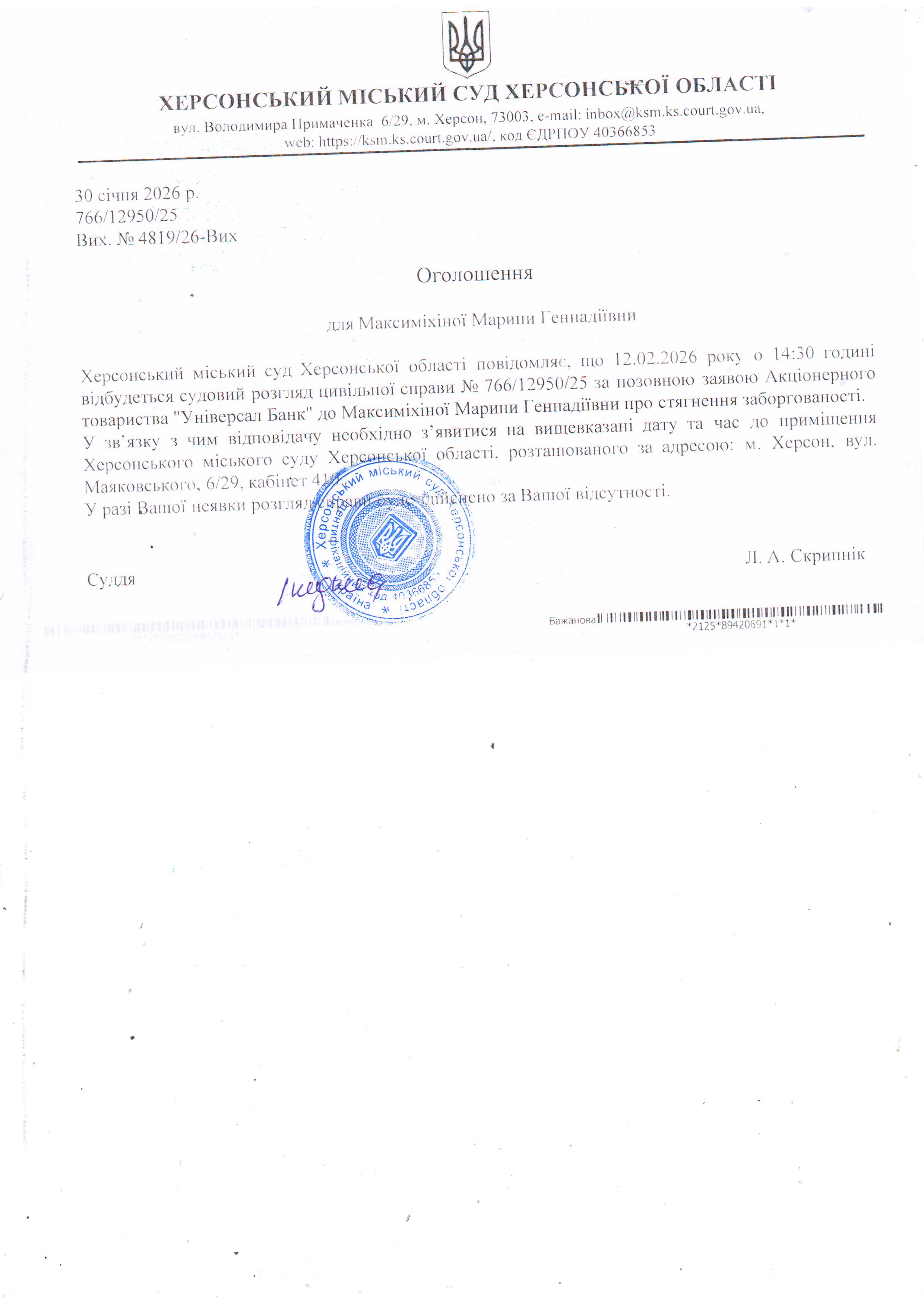 Оголошення для Максиміхіної Марини Геннадіївни