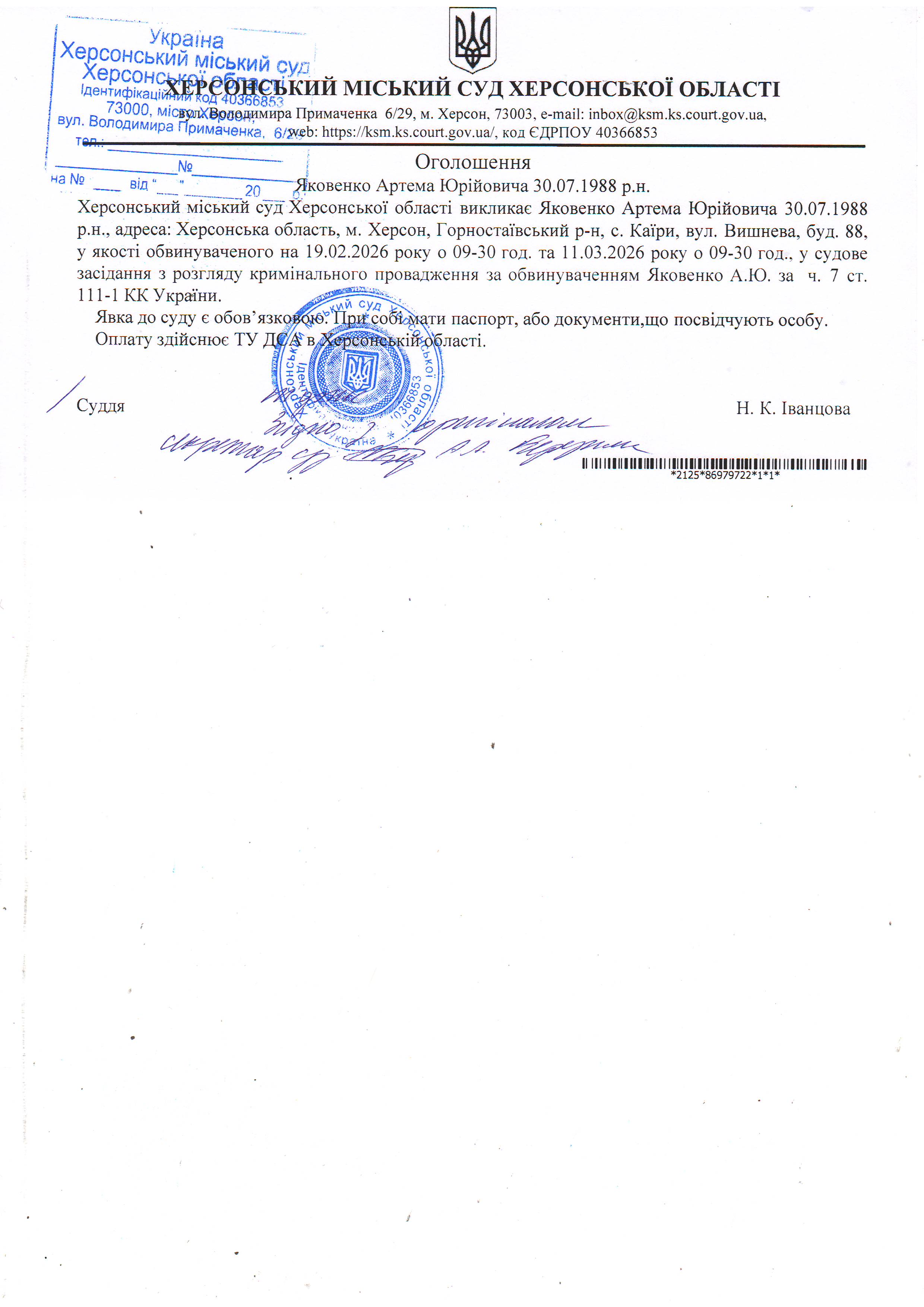 Оголошення про виклик особи в суд та повідомлення про судове рішення