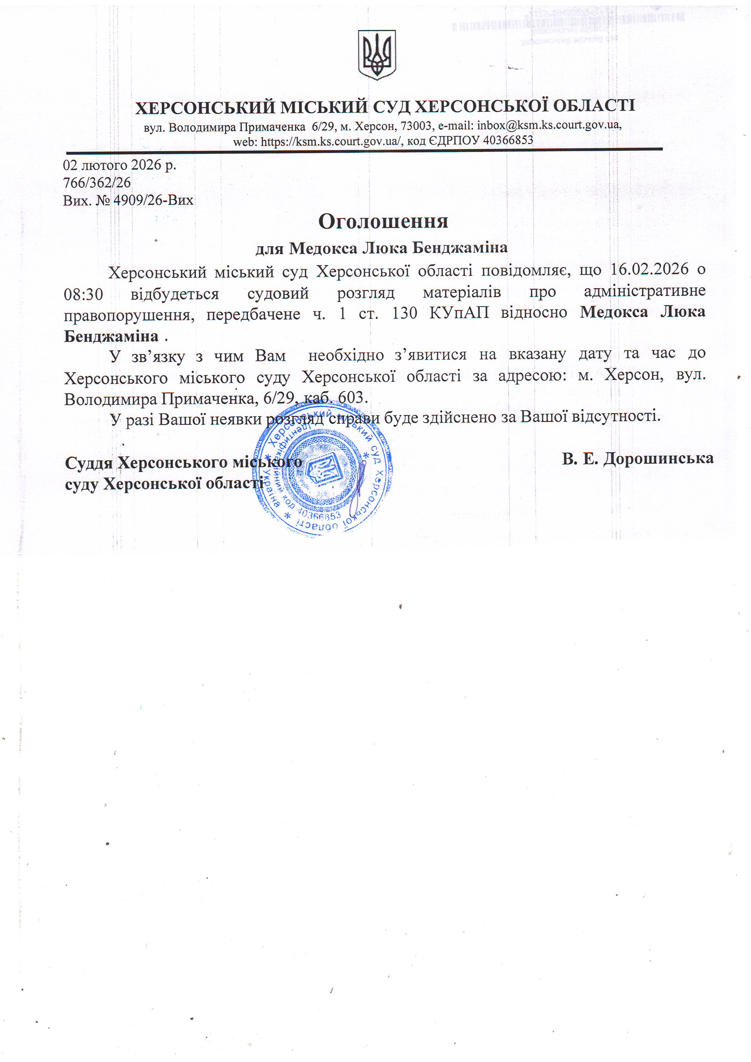 ОГОЛОШЕННЯ ПРО ВИКЛИК ДО СУДУ