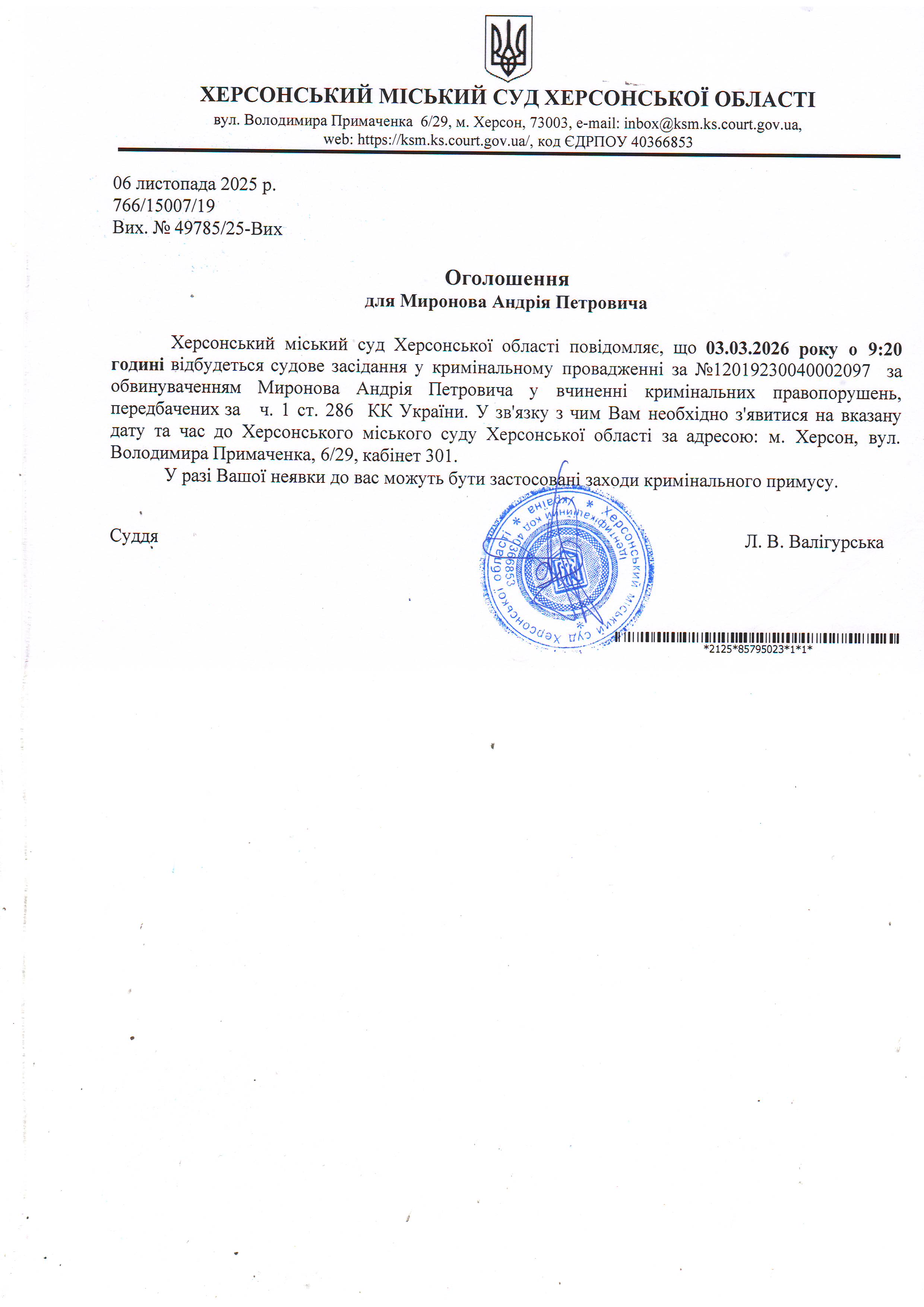 ОГОЛОШЕННЯ ПРО ВИКЛИК ДО СУДУ