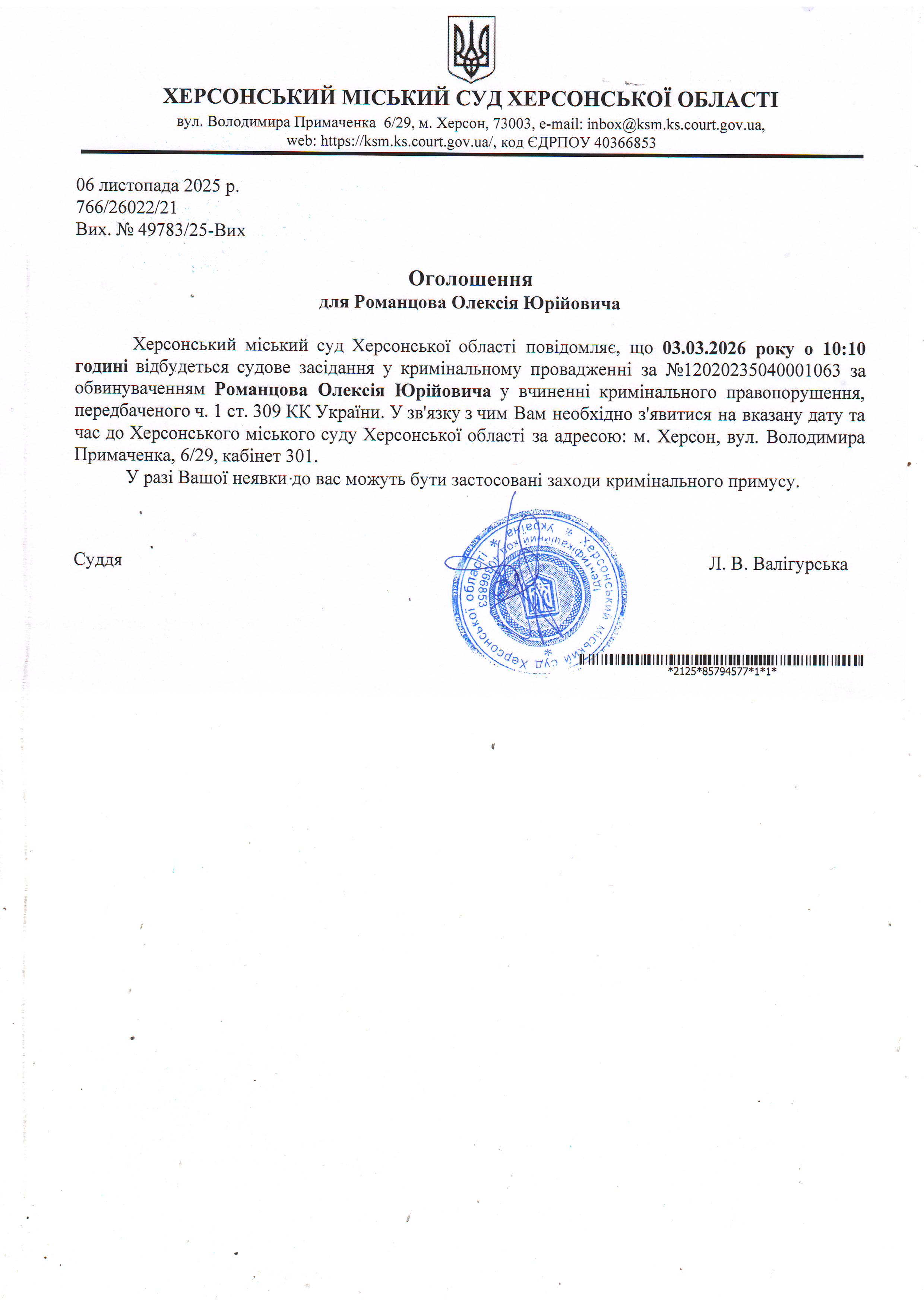 ОГОЛОШЕННЯ ПРО ВИКЛИК ДО СУДУ