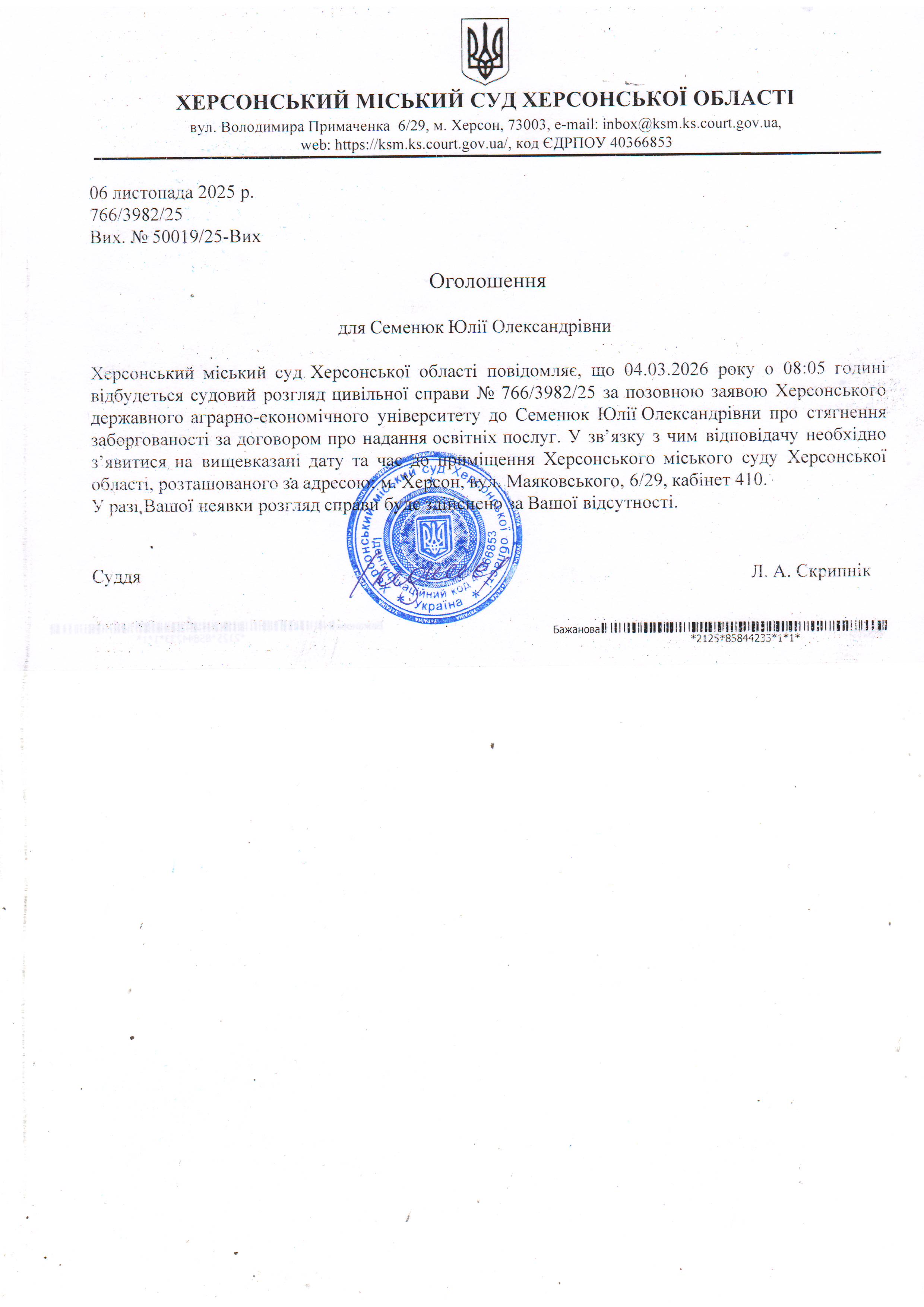 ОГОЛОШЕННЯ ПРО ВИКЛИК ДО СУДУ