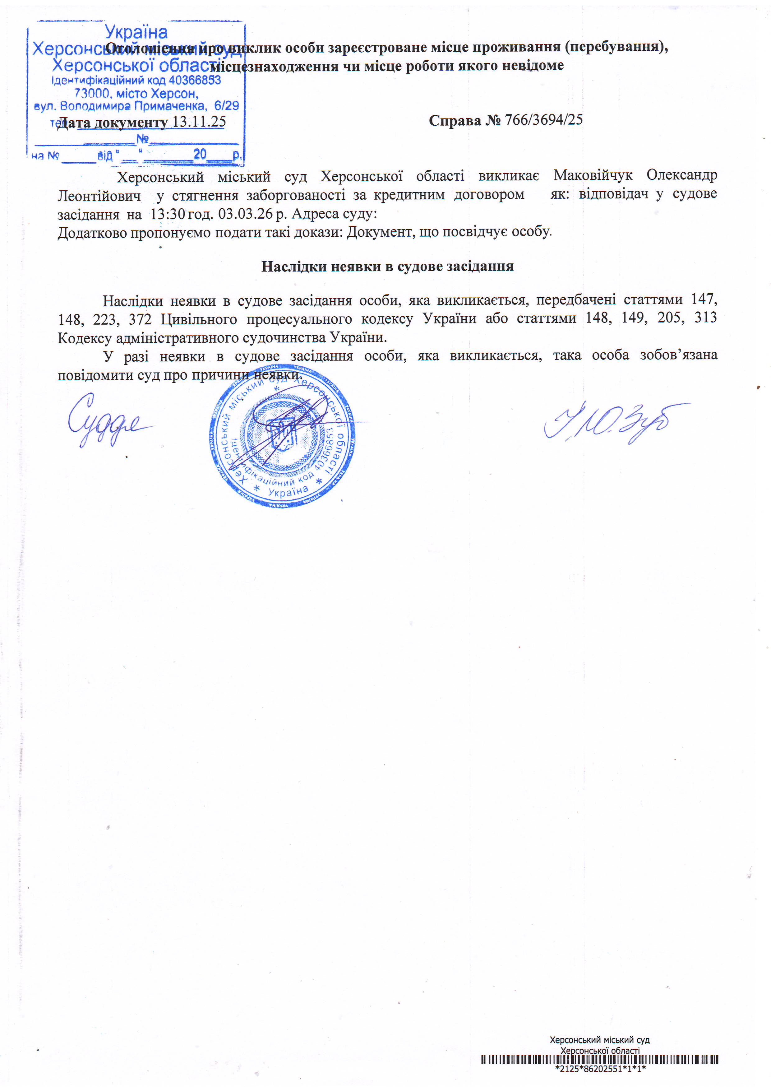 ОГОЛОШЕННЯ ПРО ВИКЛИК ДО СУДУ