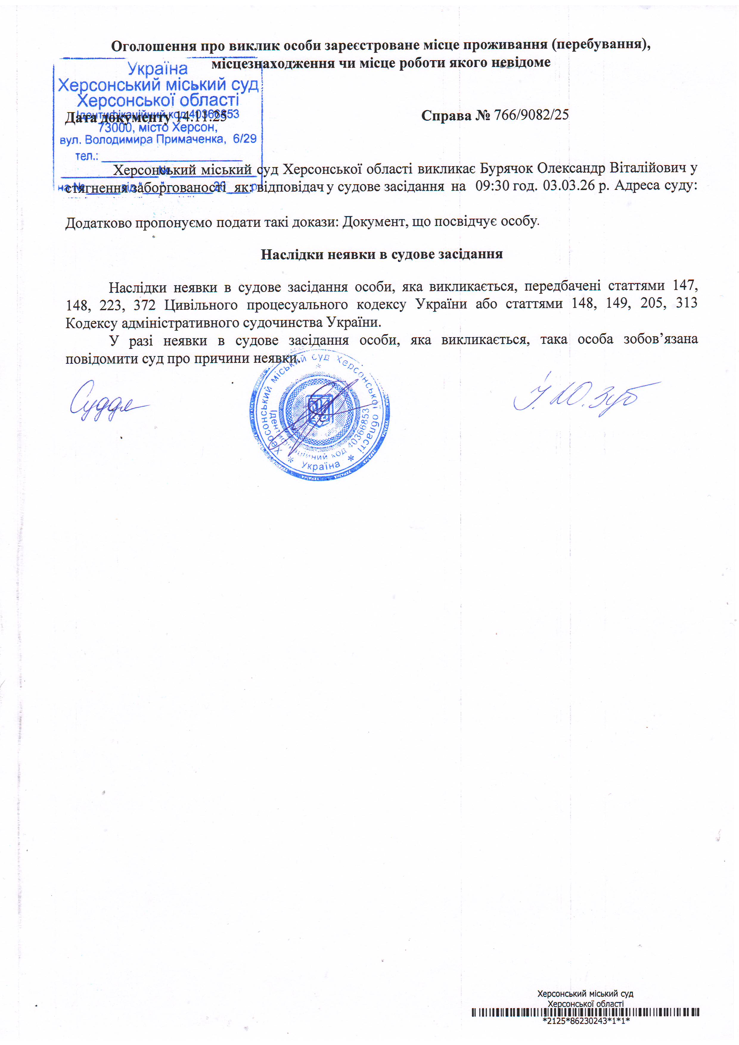 ОГОЛОШЕННЯ ПРО ВИКЛИК ДО СУДУ