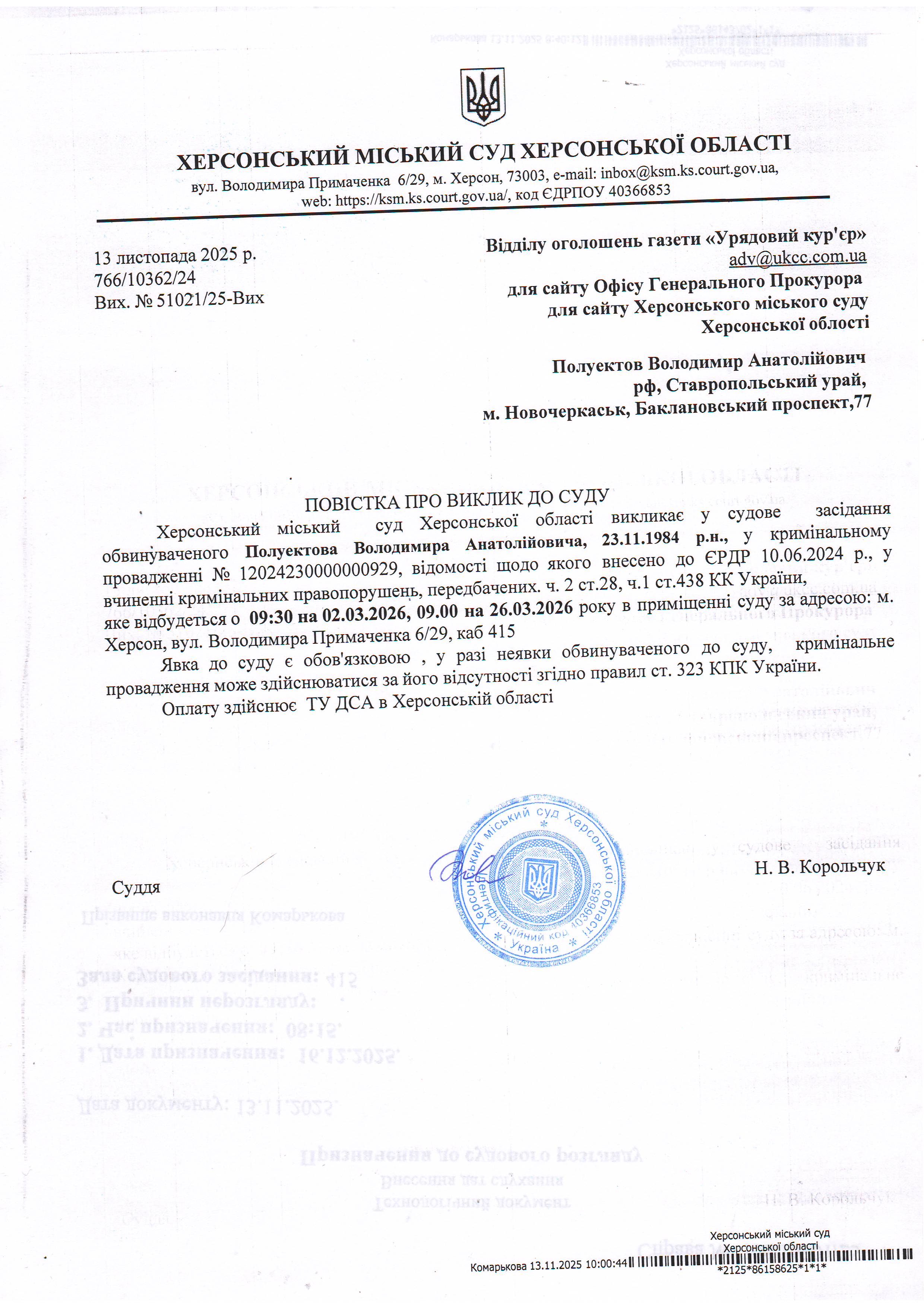 ОГОЛОШЕННЯ ПРО ВИКЛИК ДО СУДУ