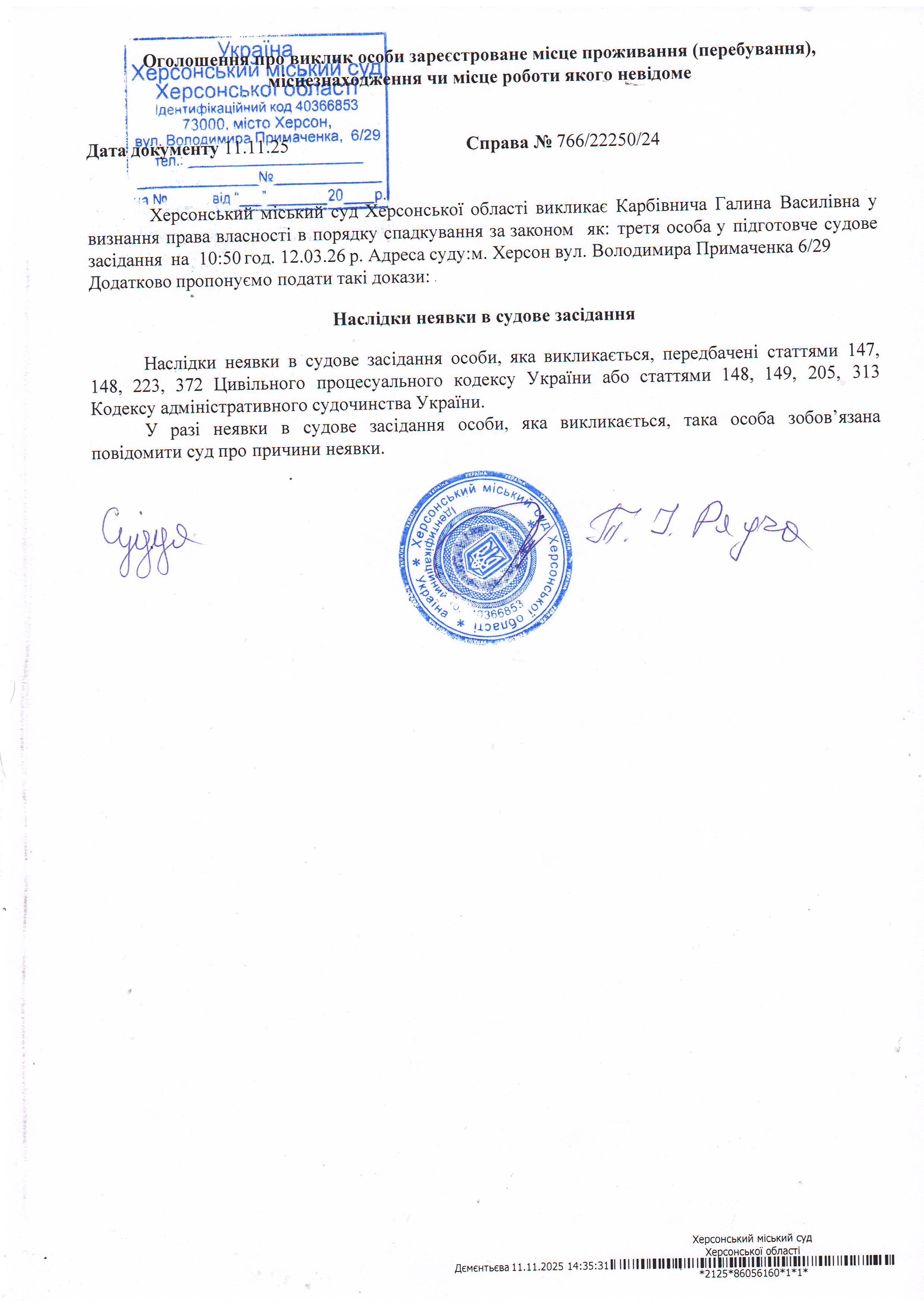 ОГОЛОШЕННЯ ПРО ВИКЛИК ДО СУДУ