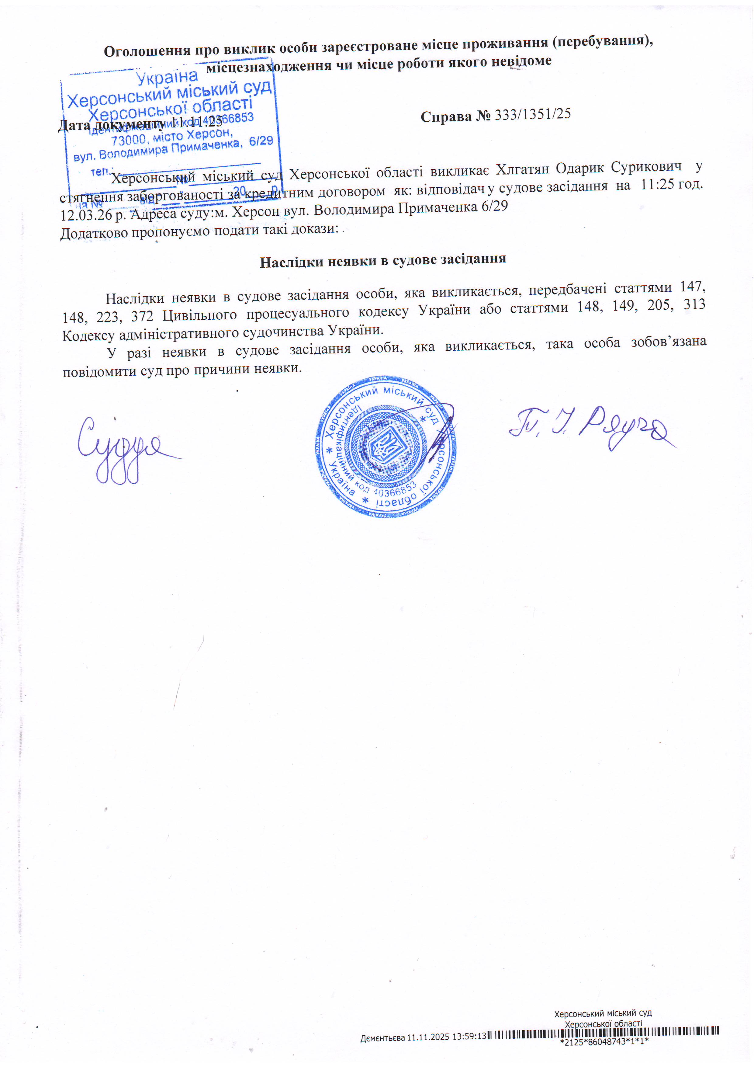 ОГОЛОШЕННЯ ПРО ВИКЛИК ДО СУДУ