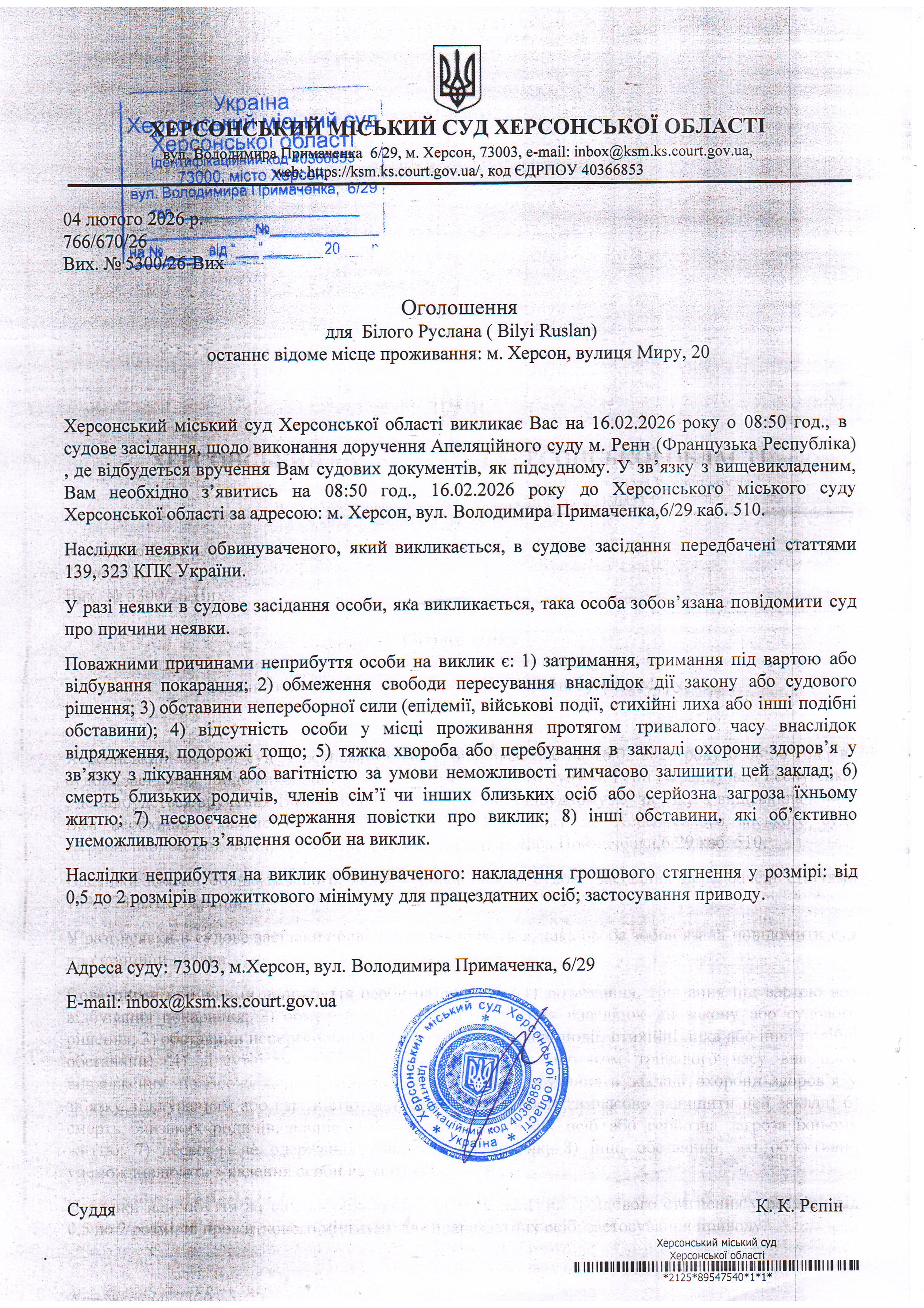 ОГОЛОШЕННЯ ПРО ВИКЛИК ДО СУДУ