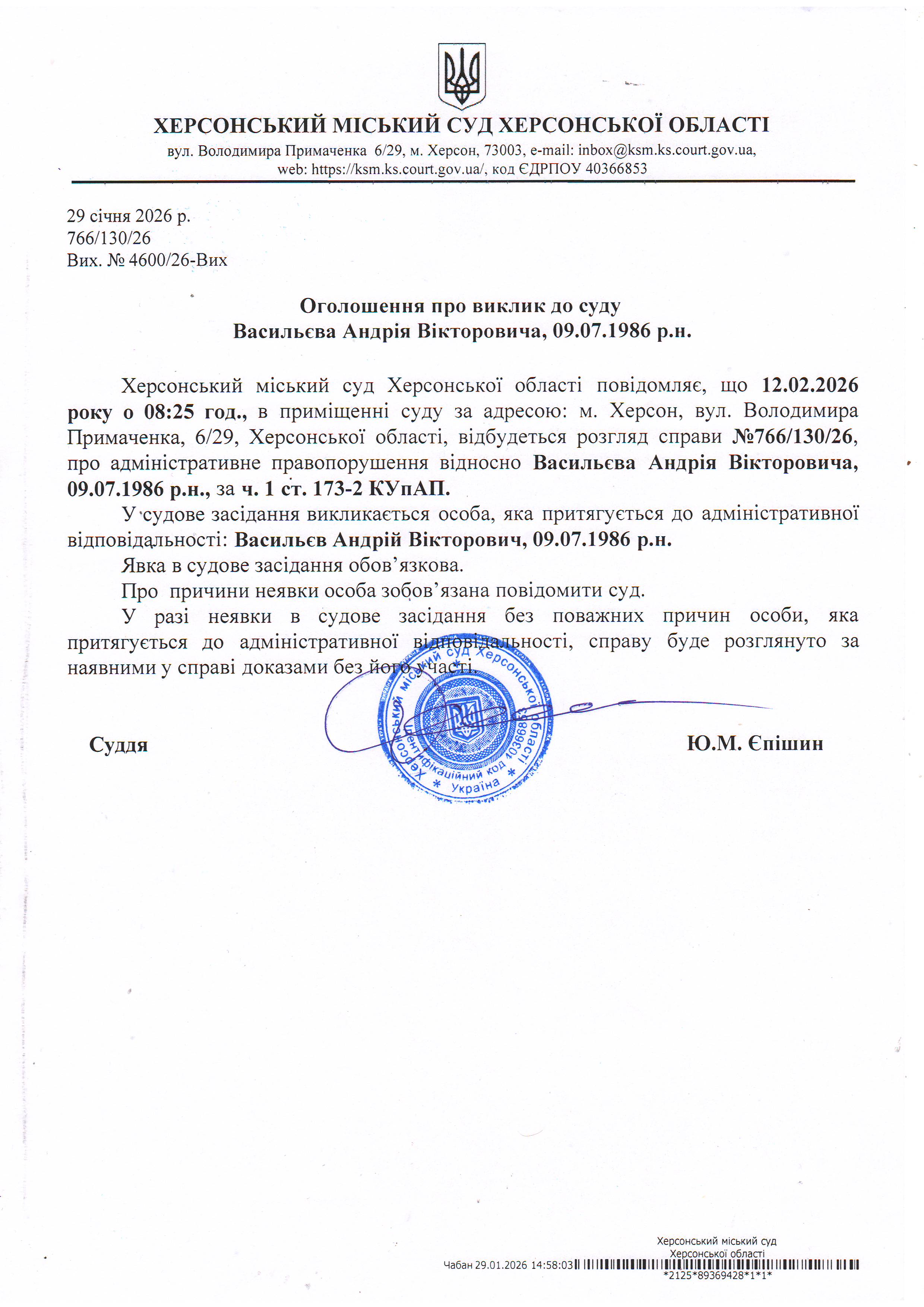 ОГОЛОШЕННЯ ПРО ВИКЛИК ДО СУДУ