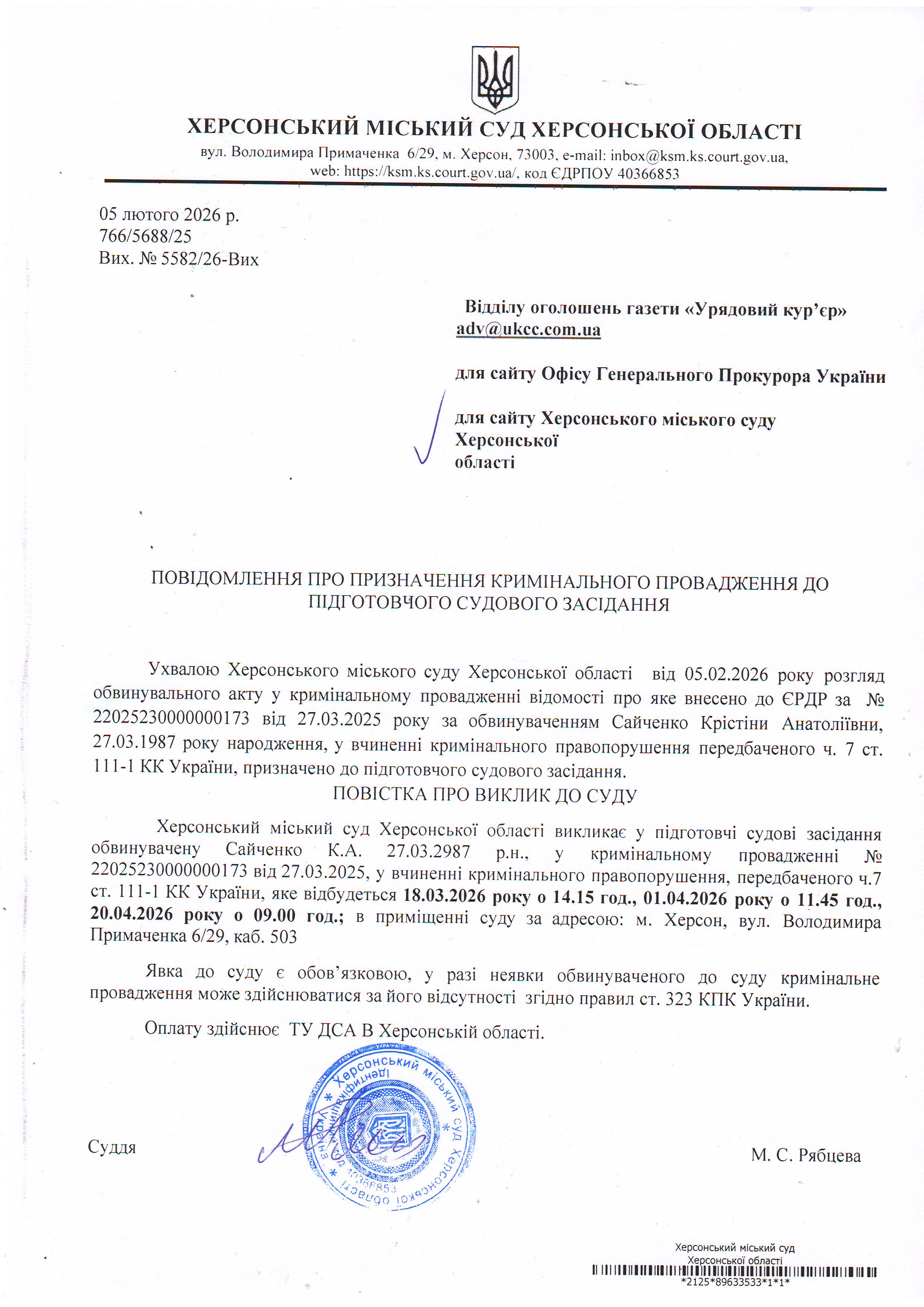 Оголошення для Сайченко Крістіни Анатоліївни