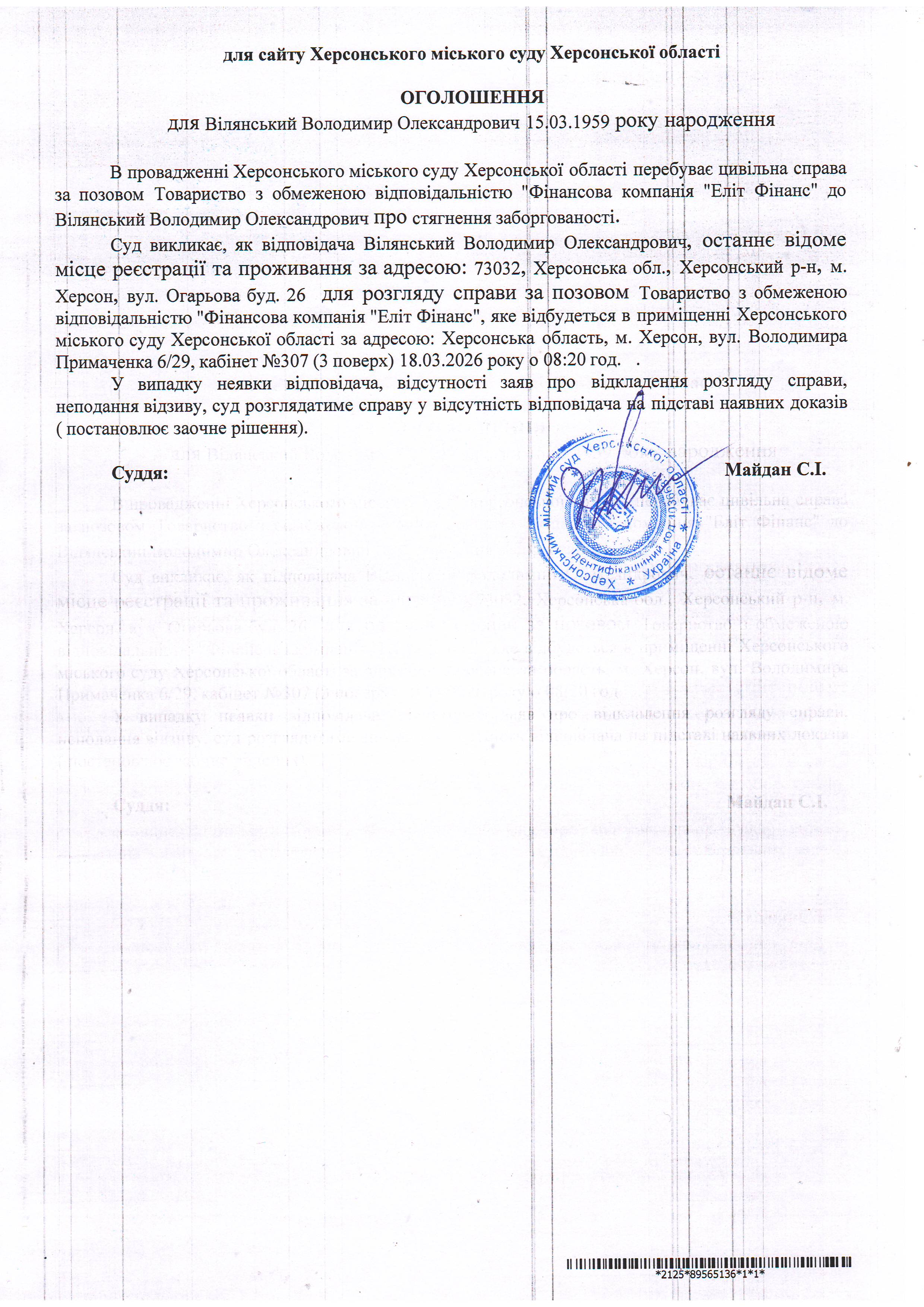 ОГОЛОШЕННЯ ПРО ВИКЛИК ДО СУДУ