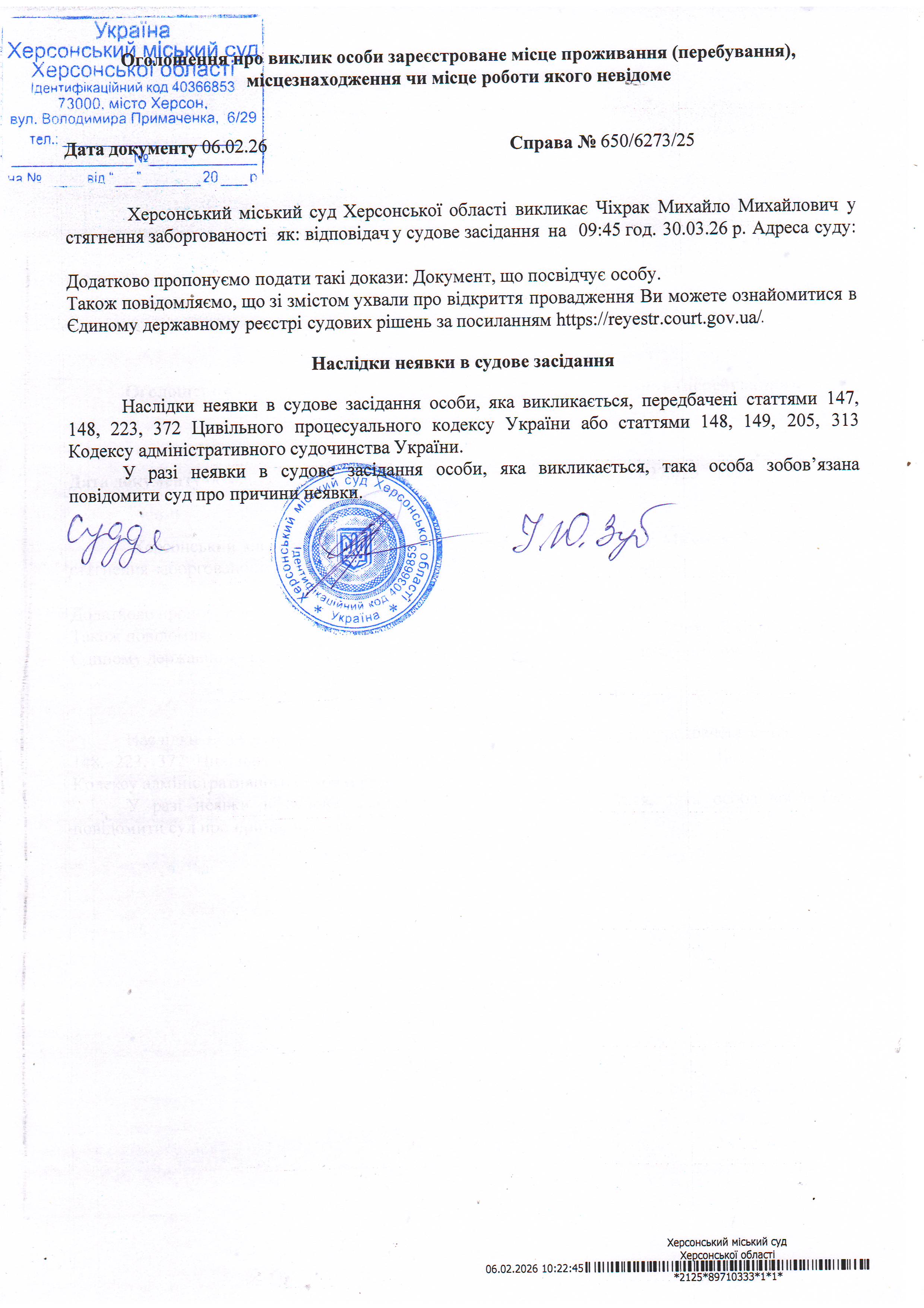 Оголошення про виклик особи в суд та повідомлення про судове рішення