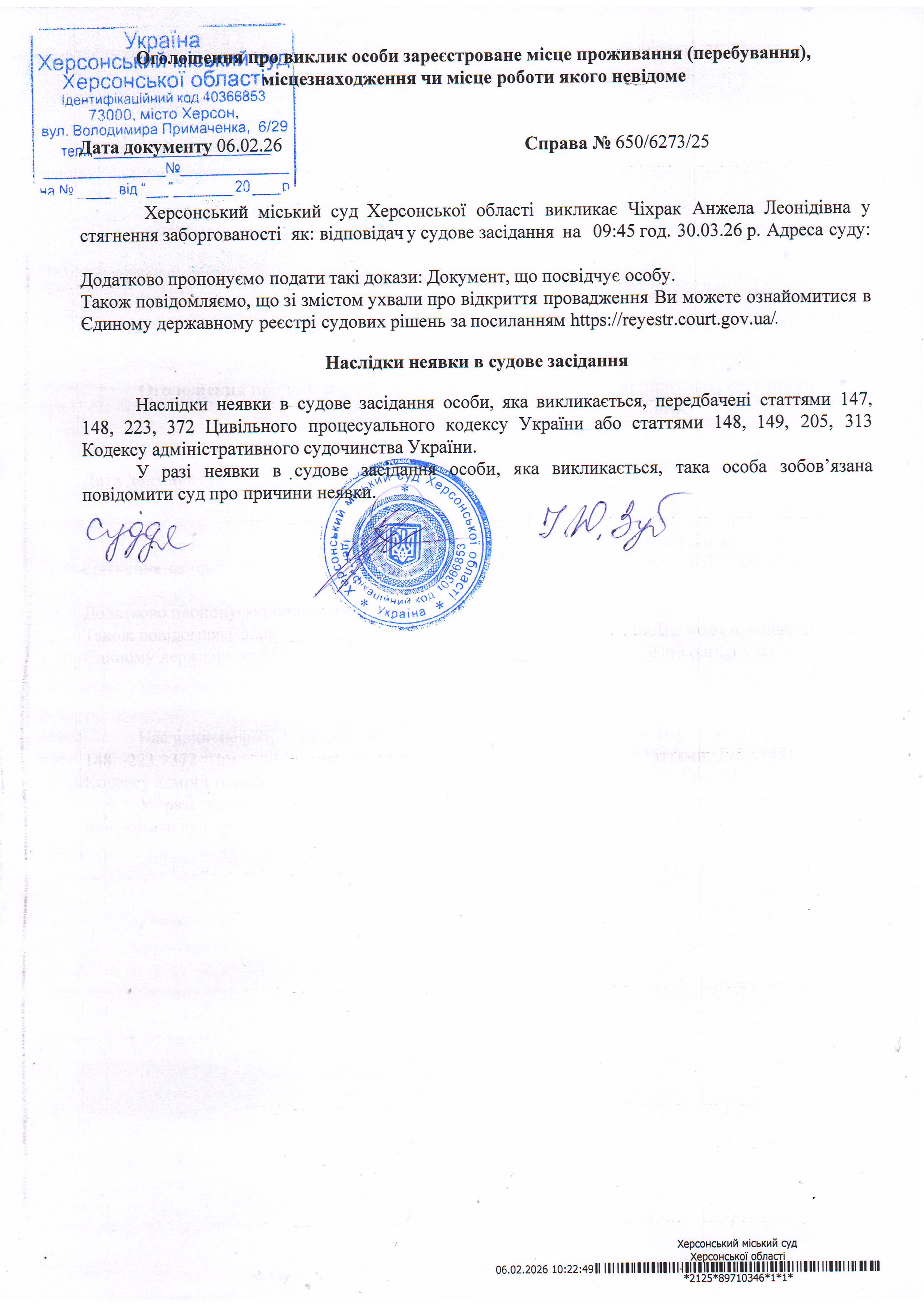 Оголошення про виклик особи в суд та повідомлення про судове рішення