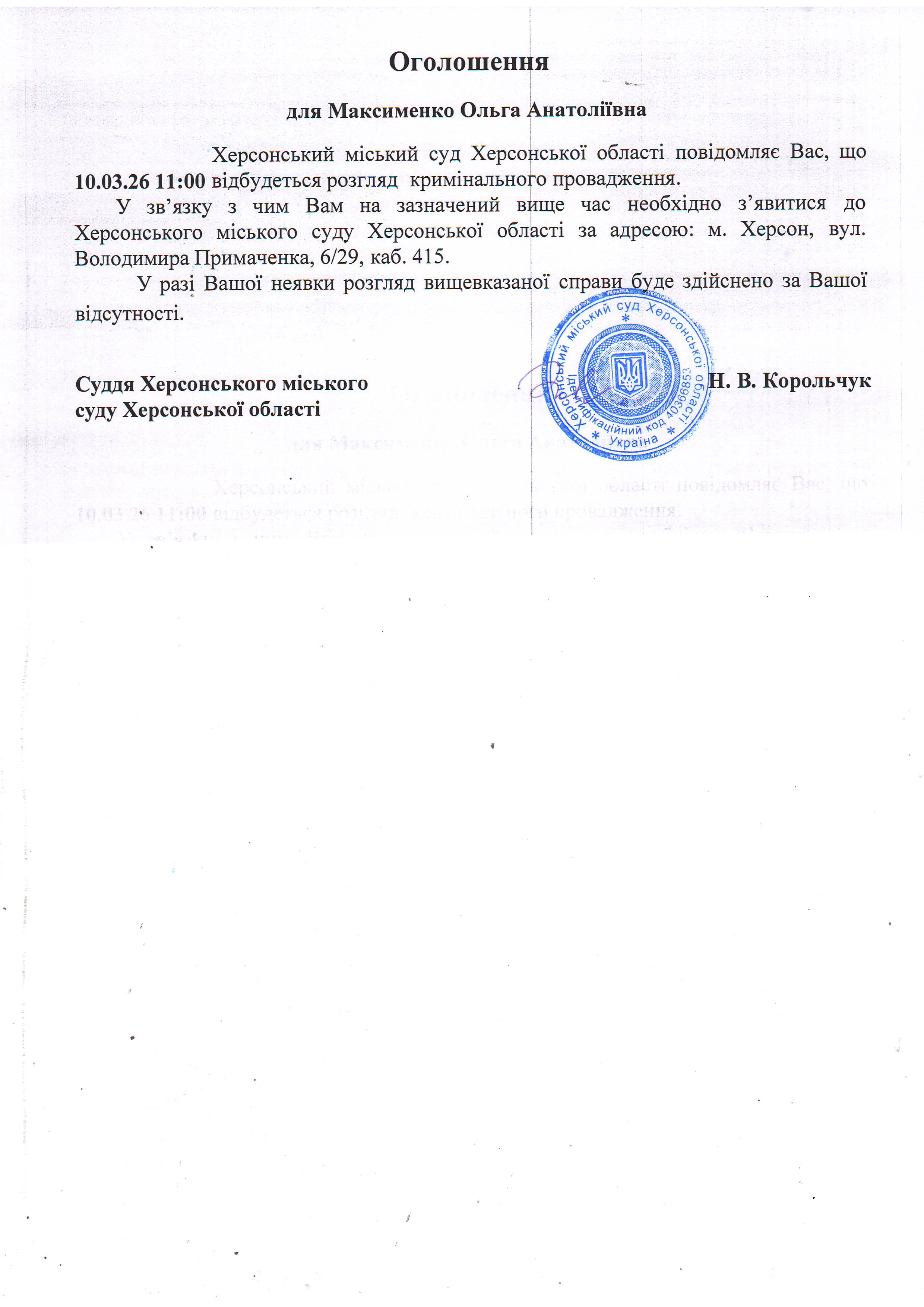 ОГОЛОШЕННЯ ПРО ВИКЛИК ДО СУДУ