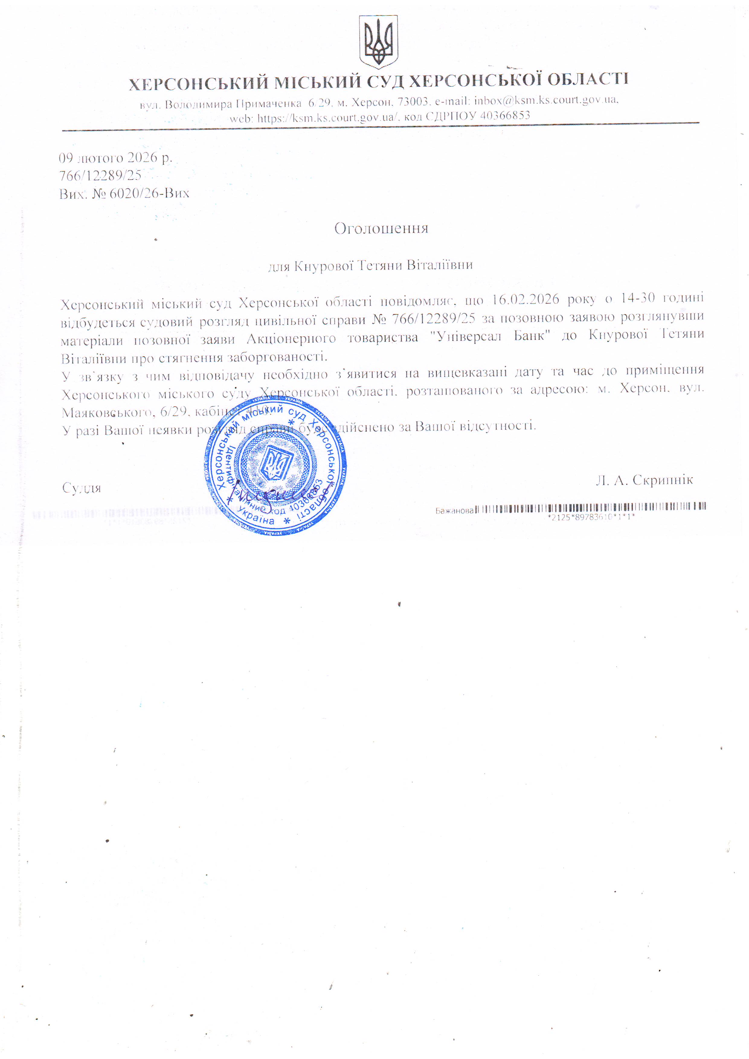 Оголошення для Кнурової Тетяни Віталіївни