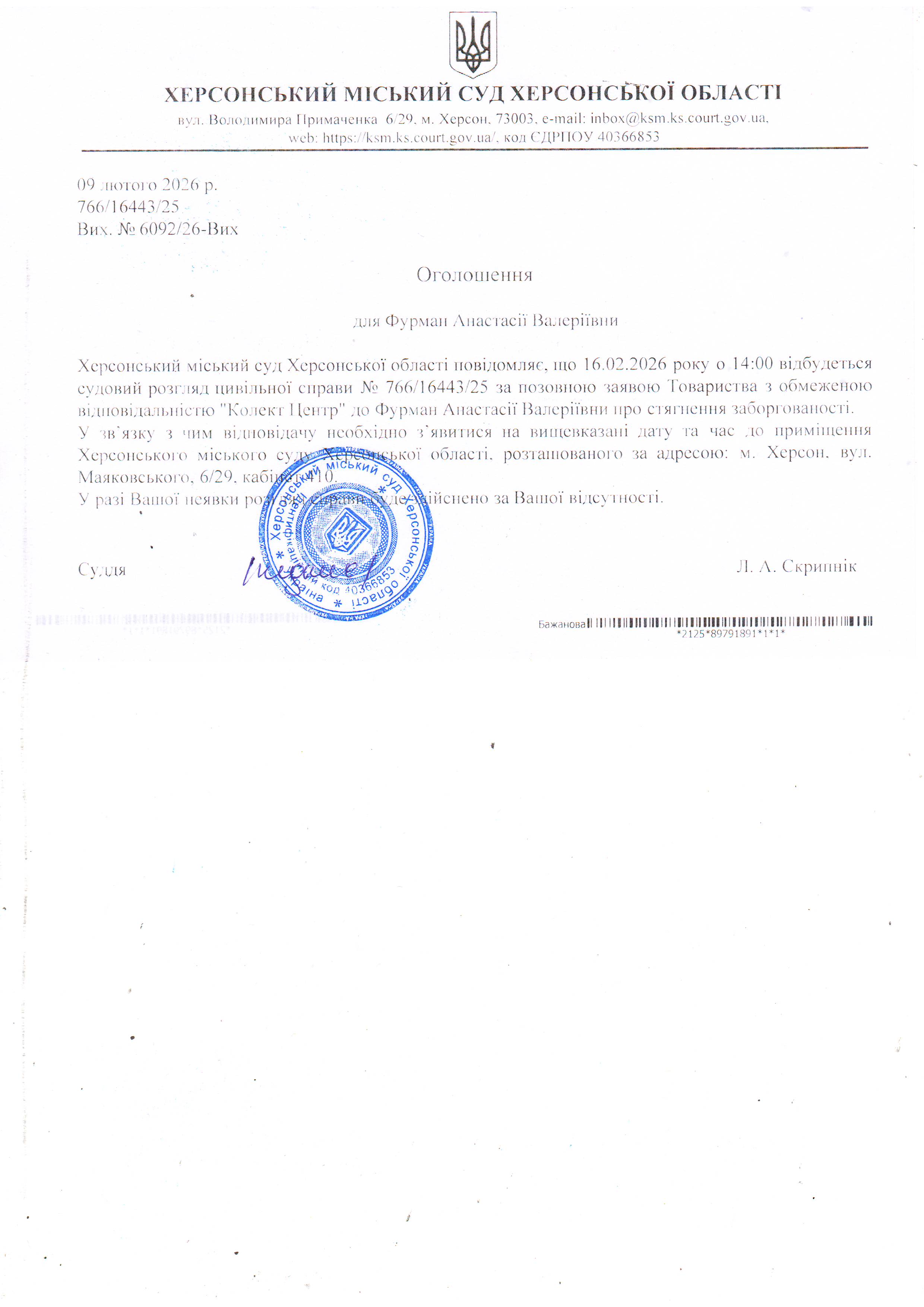 ОГОЛОШЕННЯ ПРО ВИКЛИК ДО СУДУ