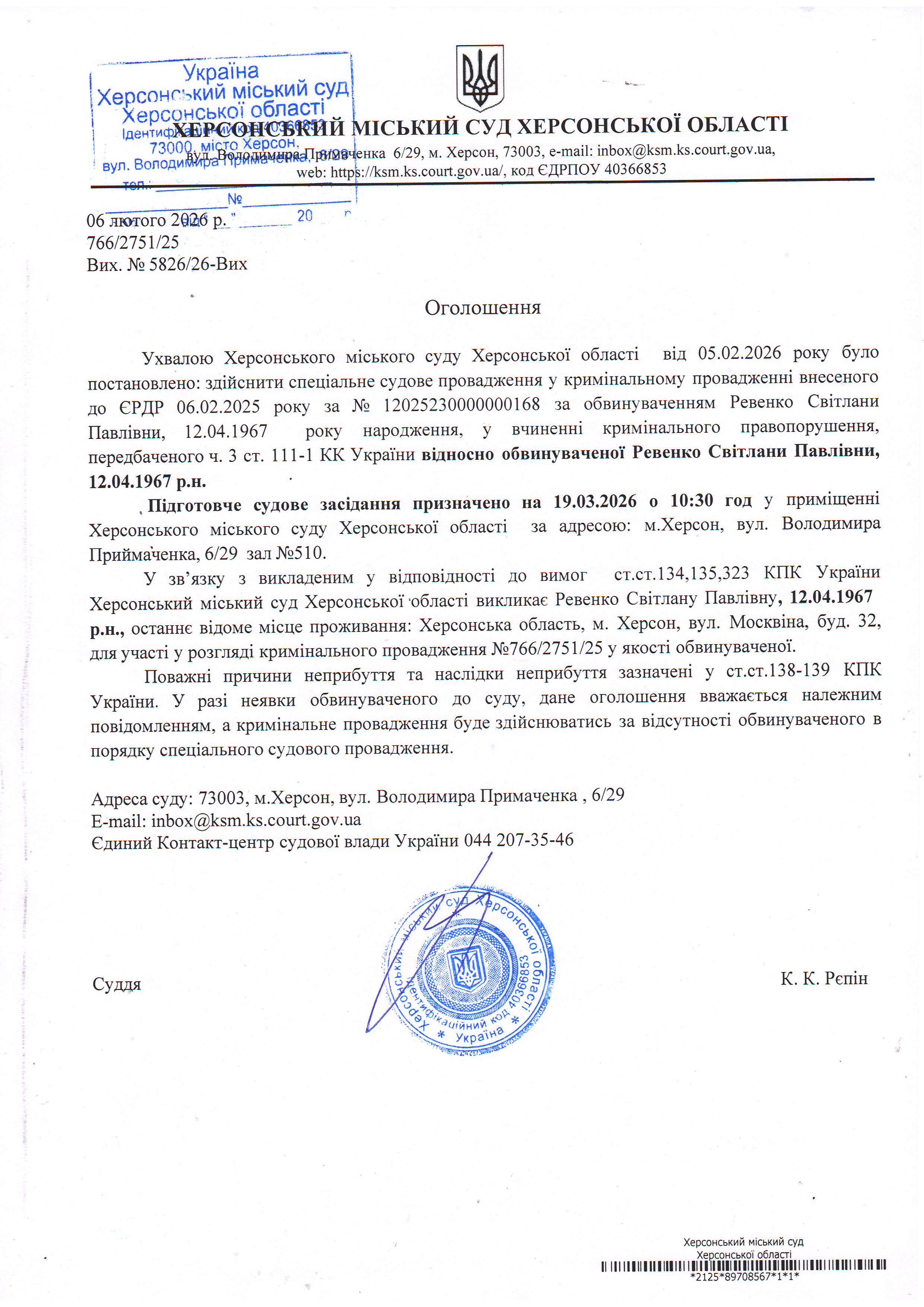 ОГОЛОШЕННЯ ПРО ВИКЛИК ДО СУДУ