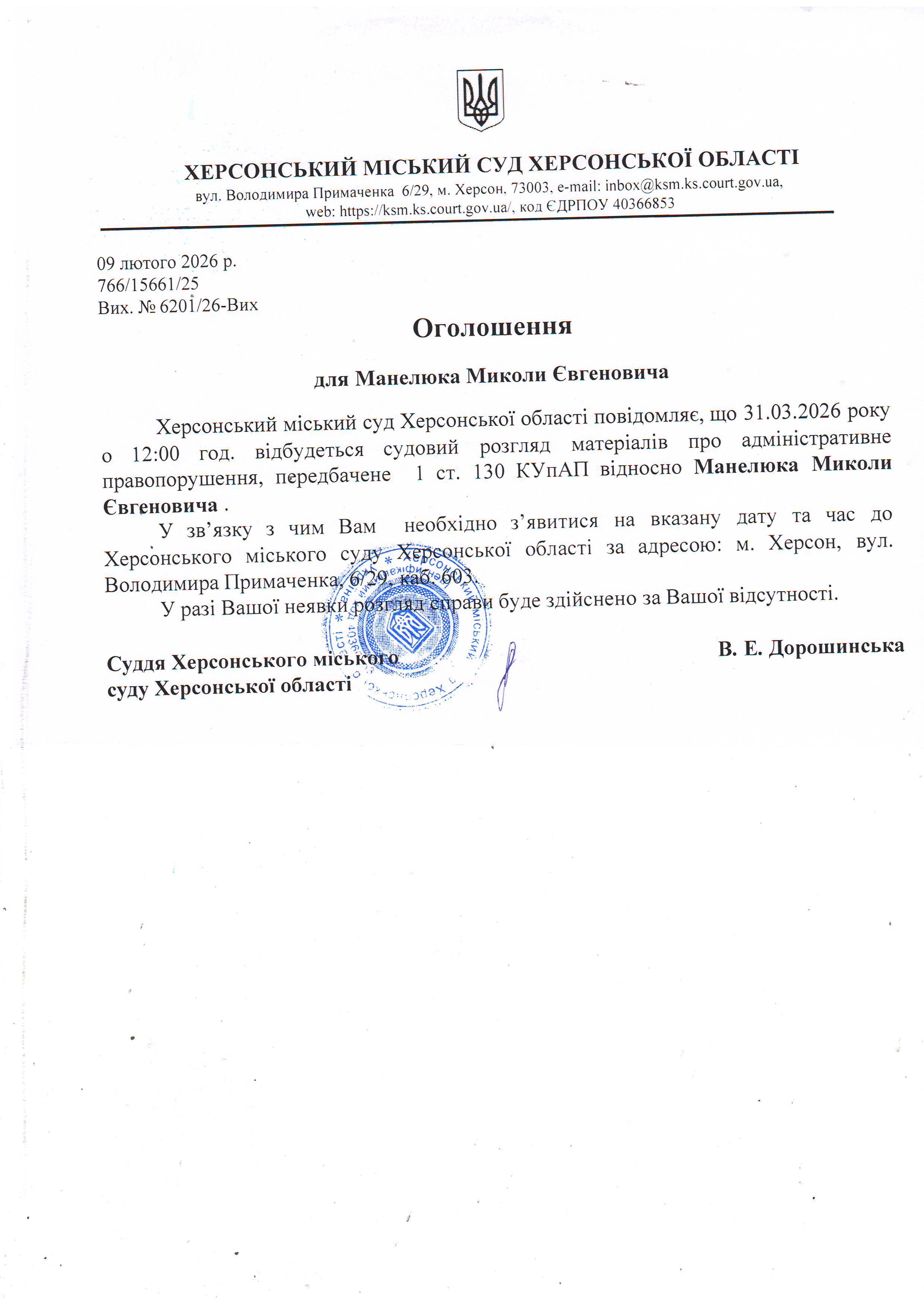 ОГОЛОШЕННЯ ПРО ВИКЛИК ДО СУДУ