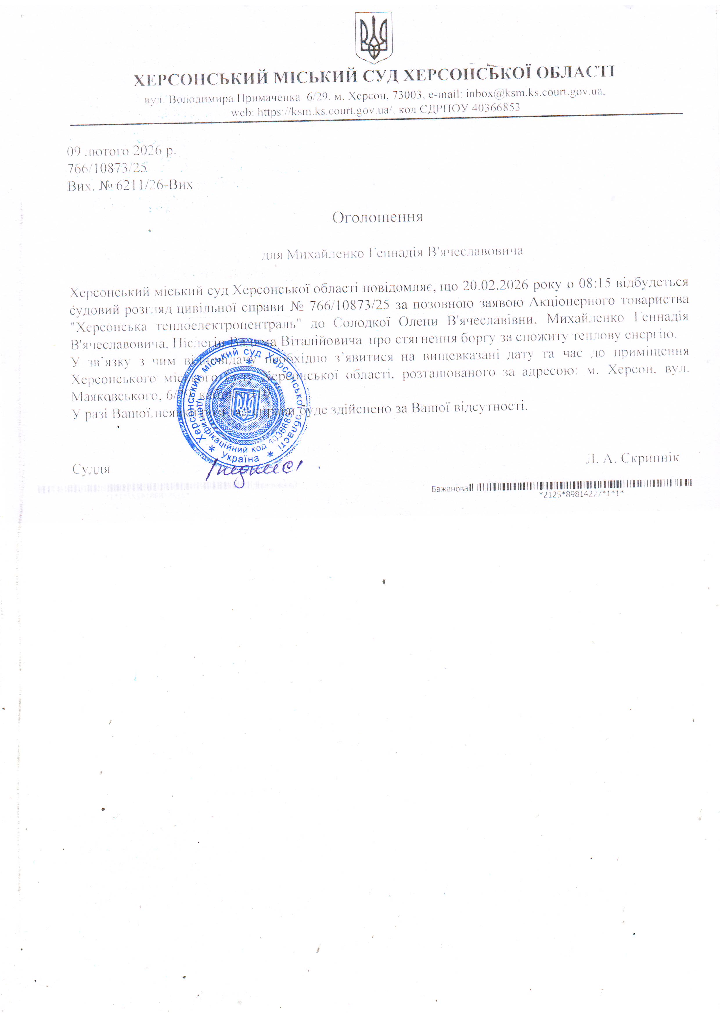 Оголошення про виклик особи в суд та повідомлення про судове рішення