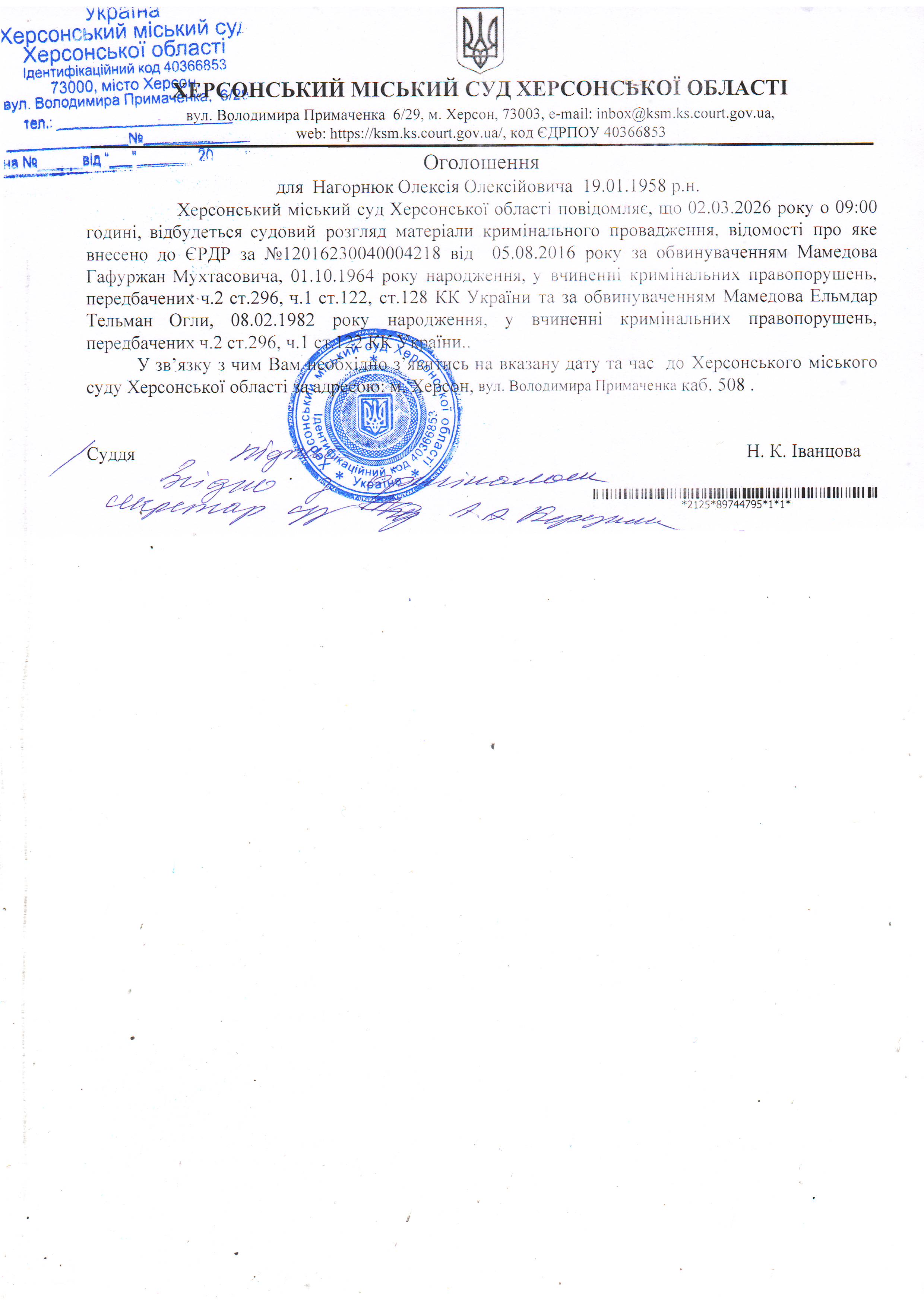 Оголошення про виклик особи в суд та повідомлення про судове рішення
