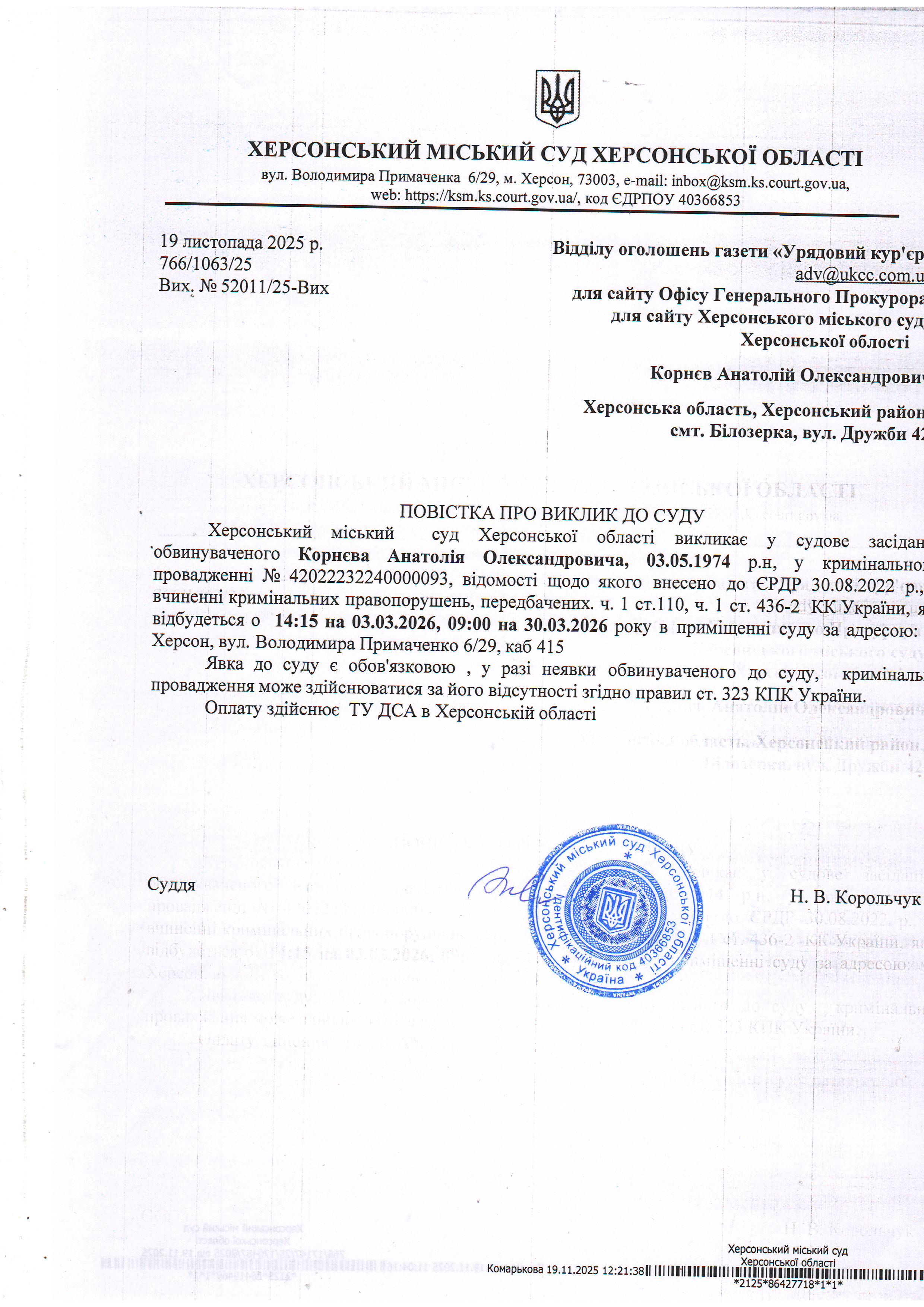 ОГОЛОШЕННЯ ПРО ВИКЛИК ДО СУДУ