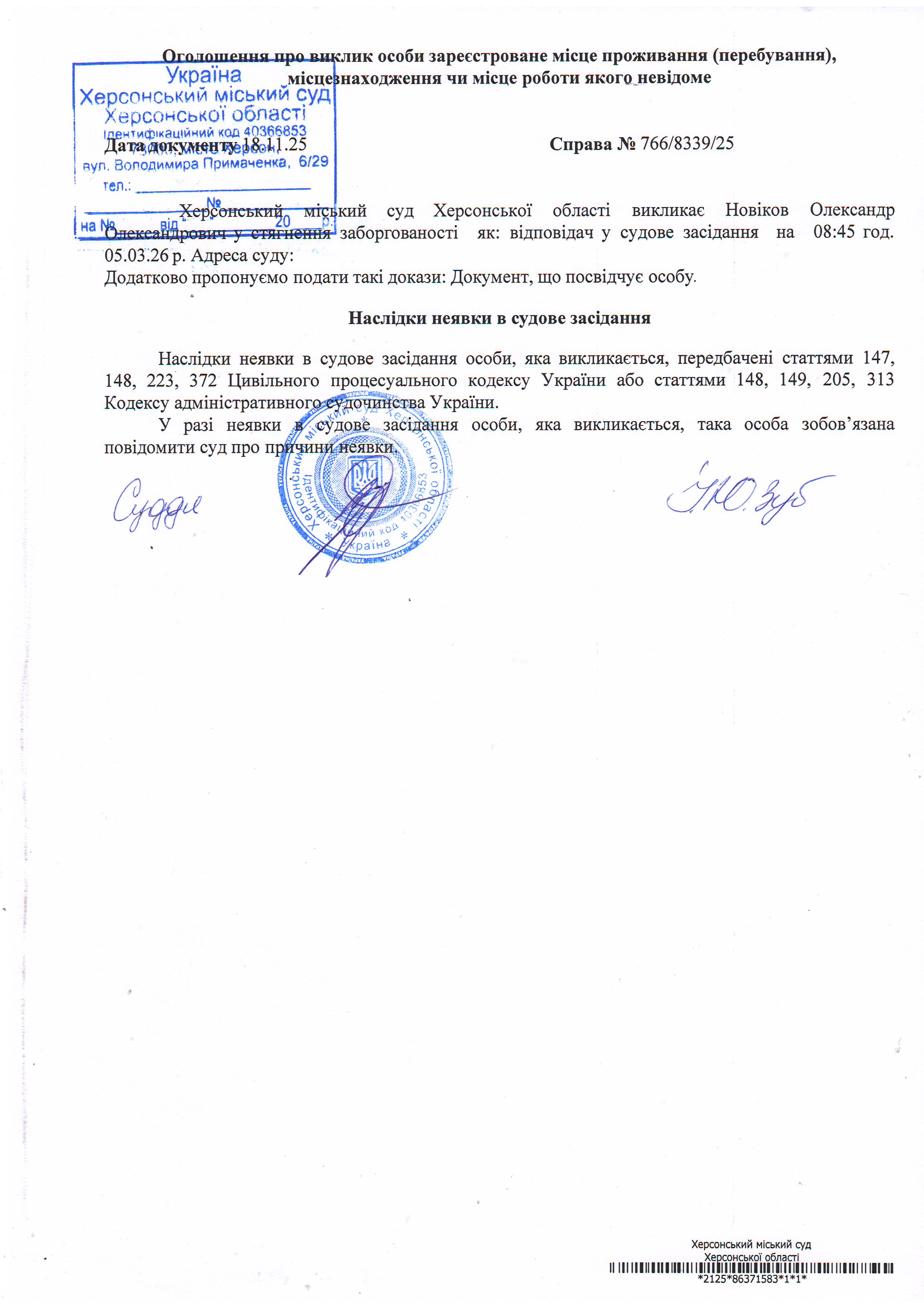 ОГОЛОШЕННЯ ПРО ВИКЛИК ДО СУДУ