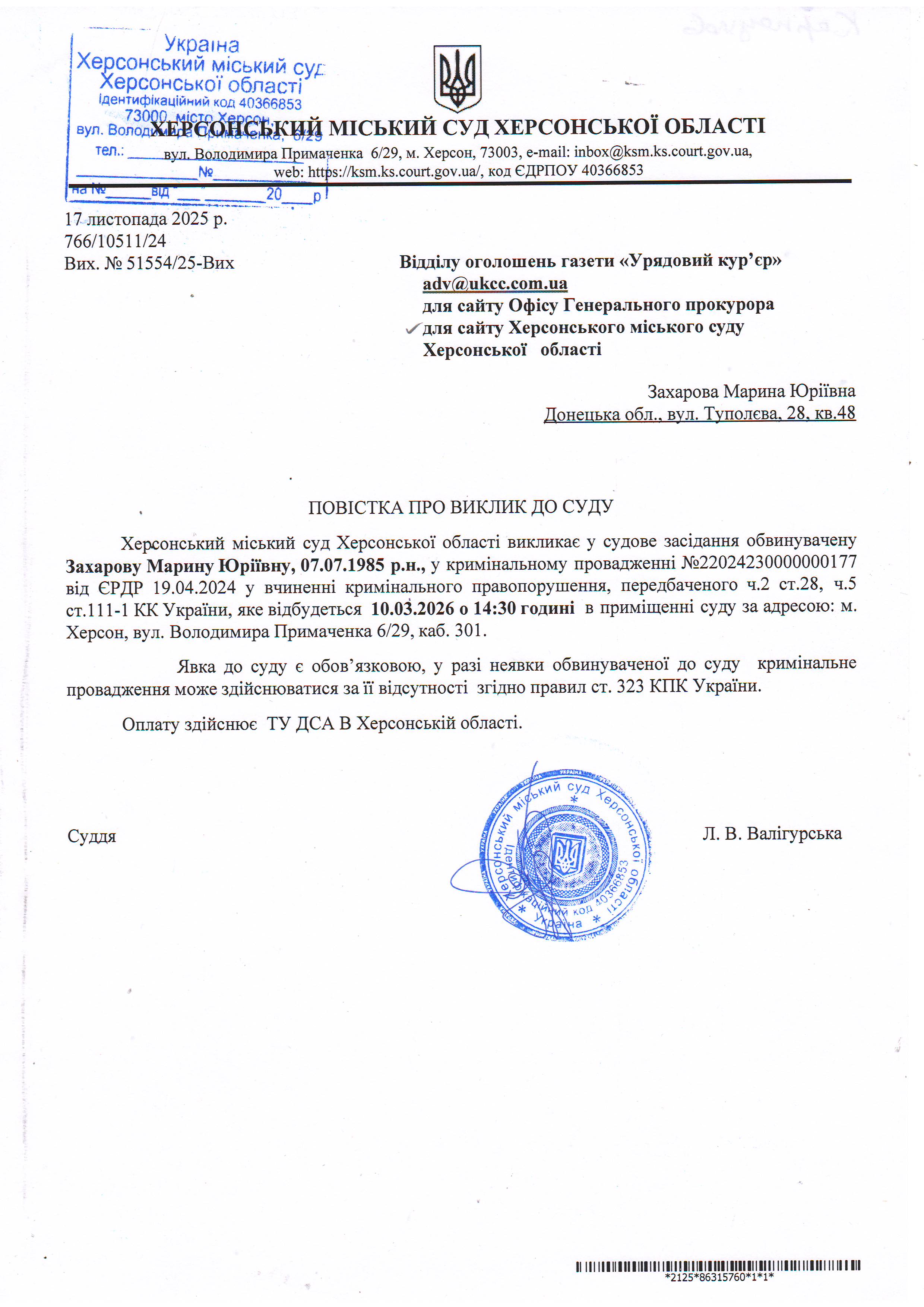 ОГОЛОШЕННЯ ПРО ВИКЛИК ДО СУДУ