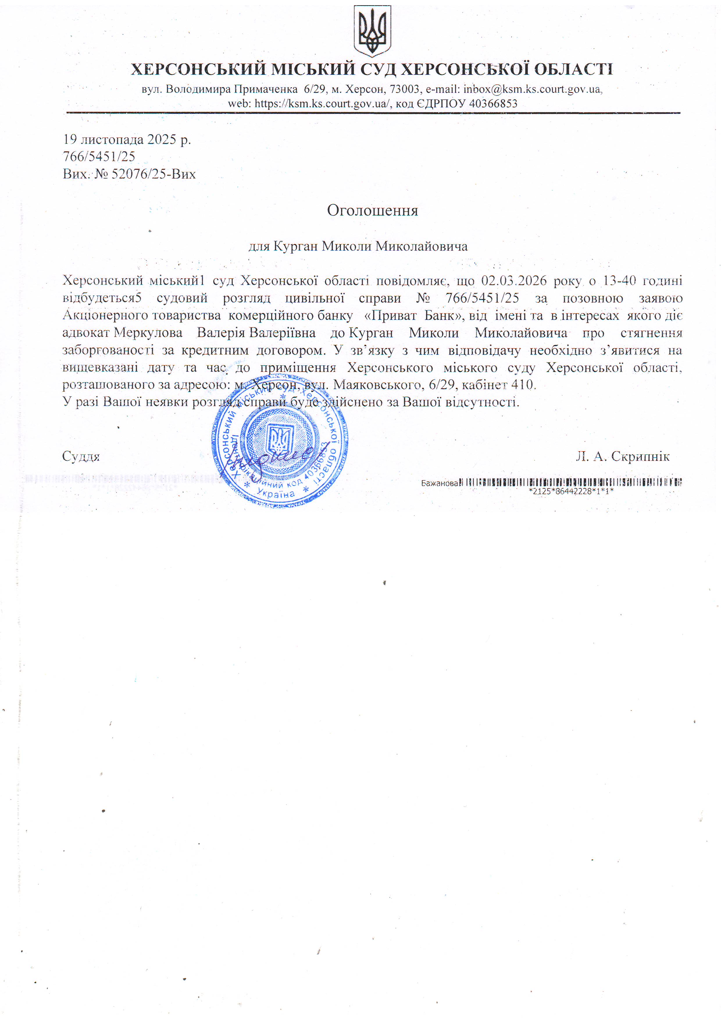 ОГОЛОШЕННЯ ПРО ВИКЛИК ДО СУДУ
