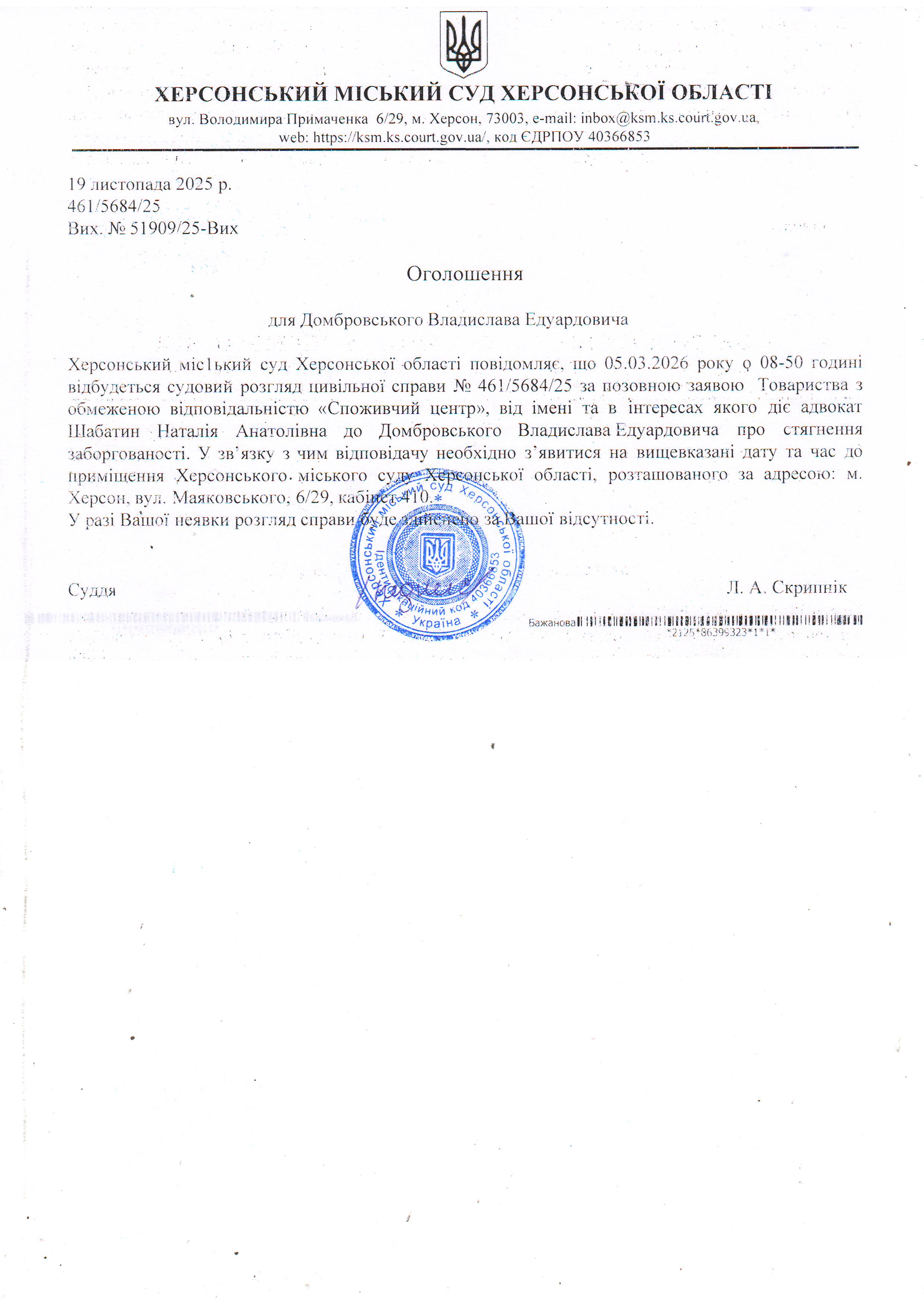ОГОЛОШЕННЯ ПРО ВИКЛИК ДО СУДУ