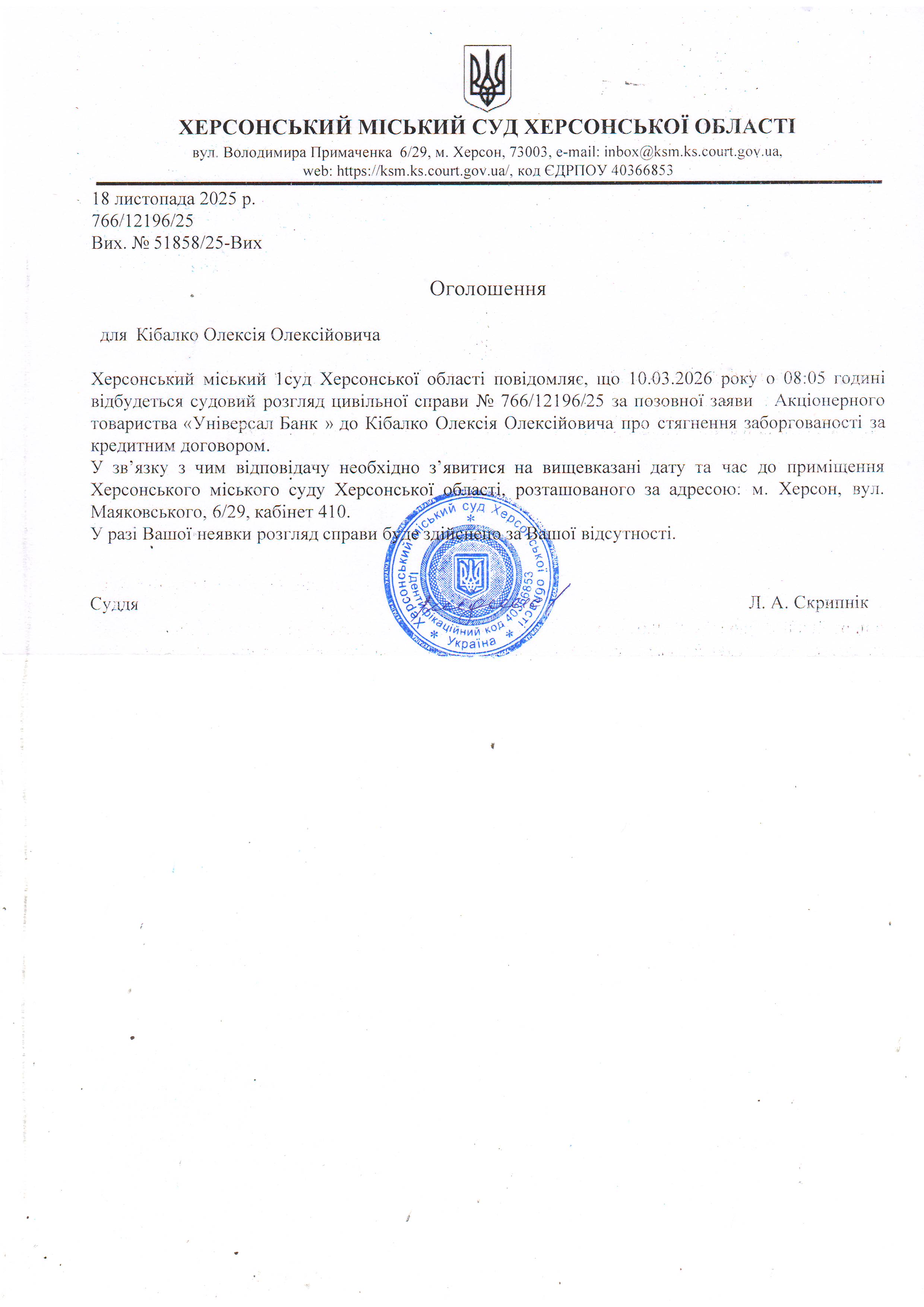 ОГОЛОШЕННЯ ПРО ВИКЛИК ДО СУДУ