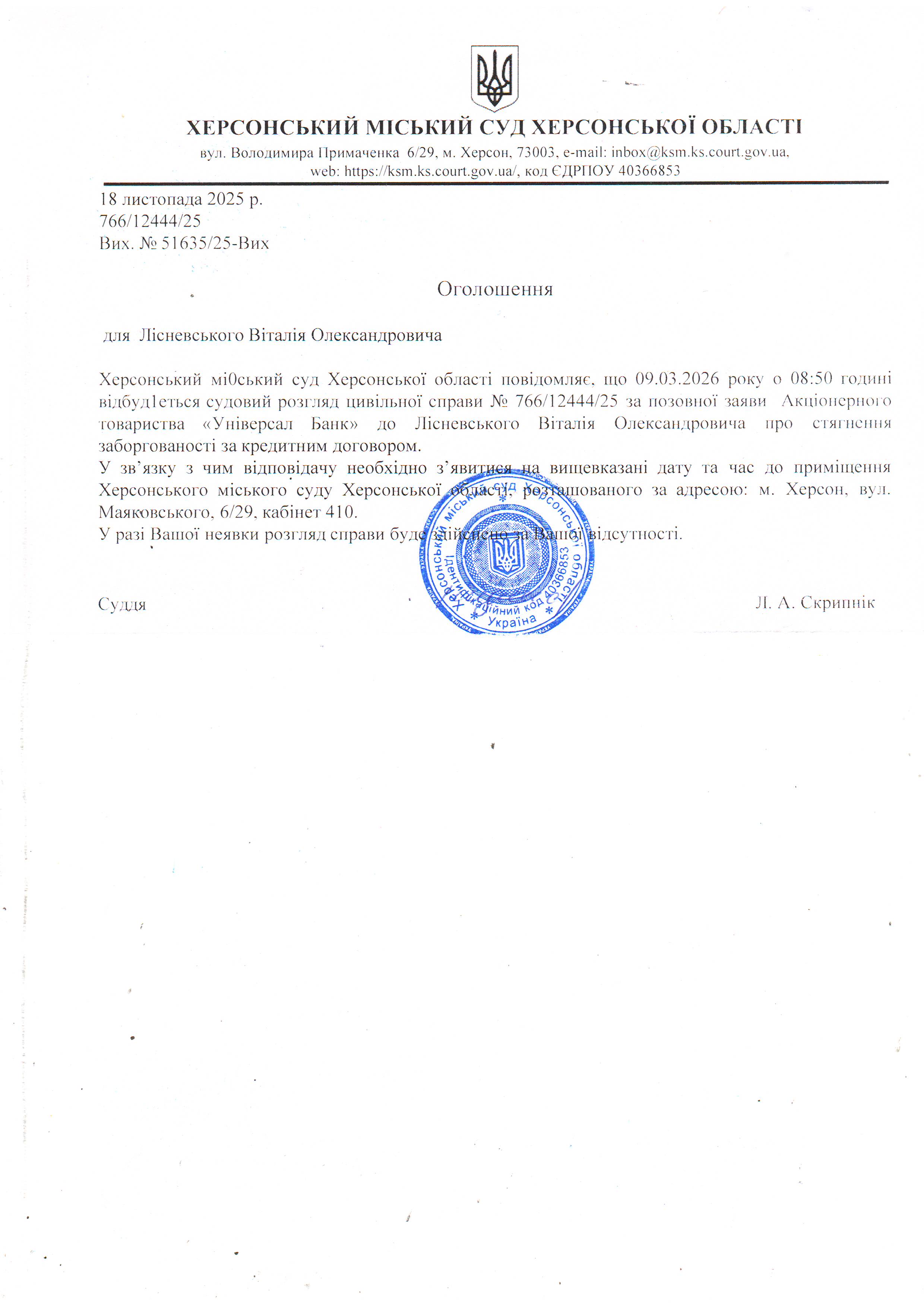 ОГОЛОШЕННЯ ПРО ВИКЛИК ДО СУДУ