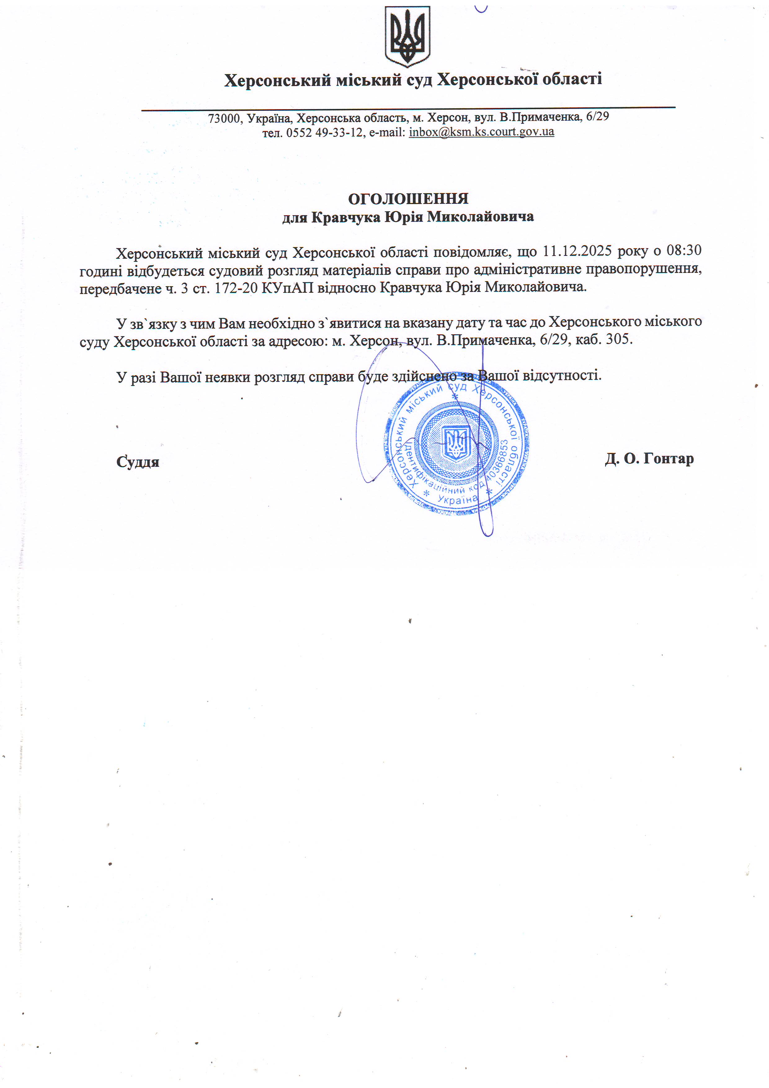Оголошення для Кравчука Юрія Миколайовича