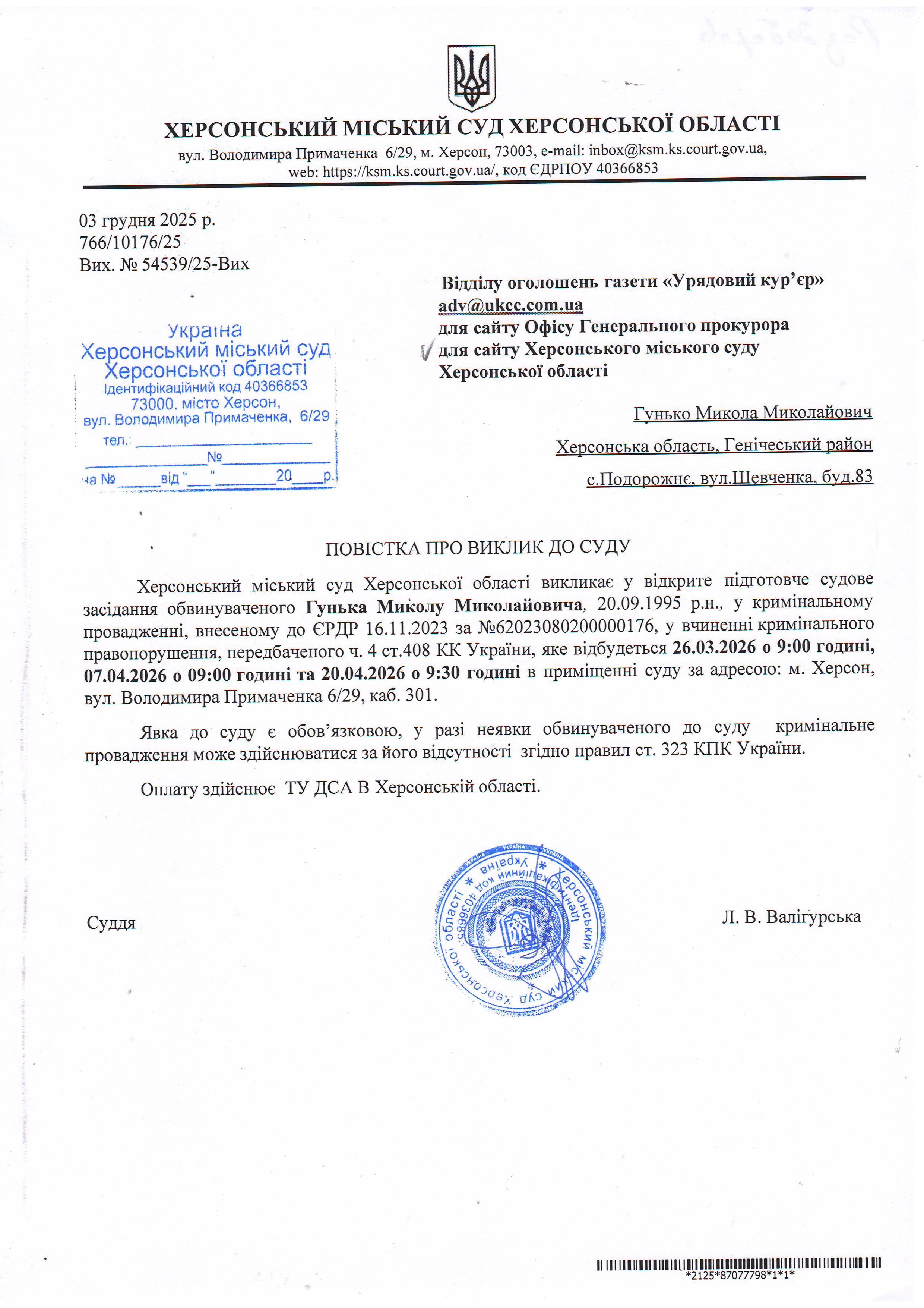 ОГОЛОШЕННЯ ПРО ВИКЛИК ДО СУДУ