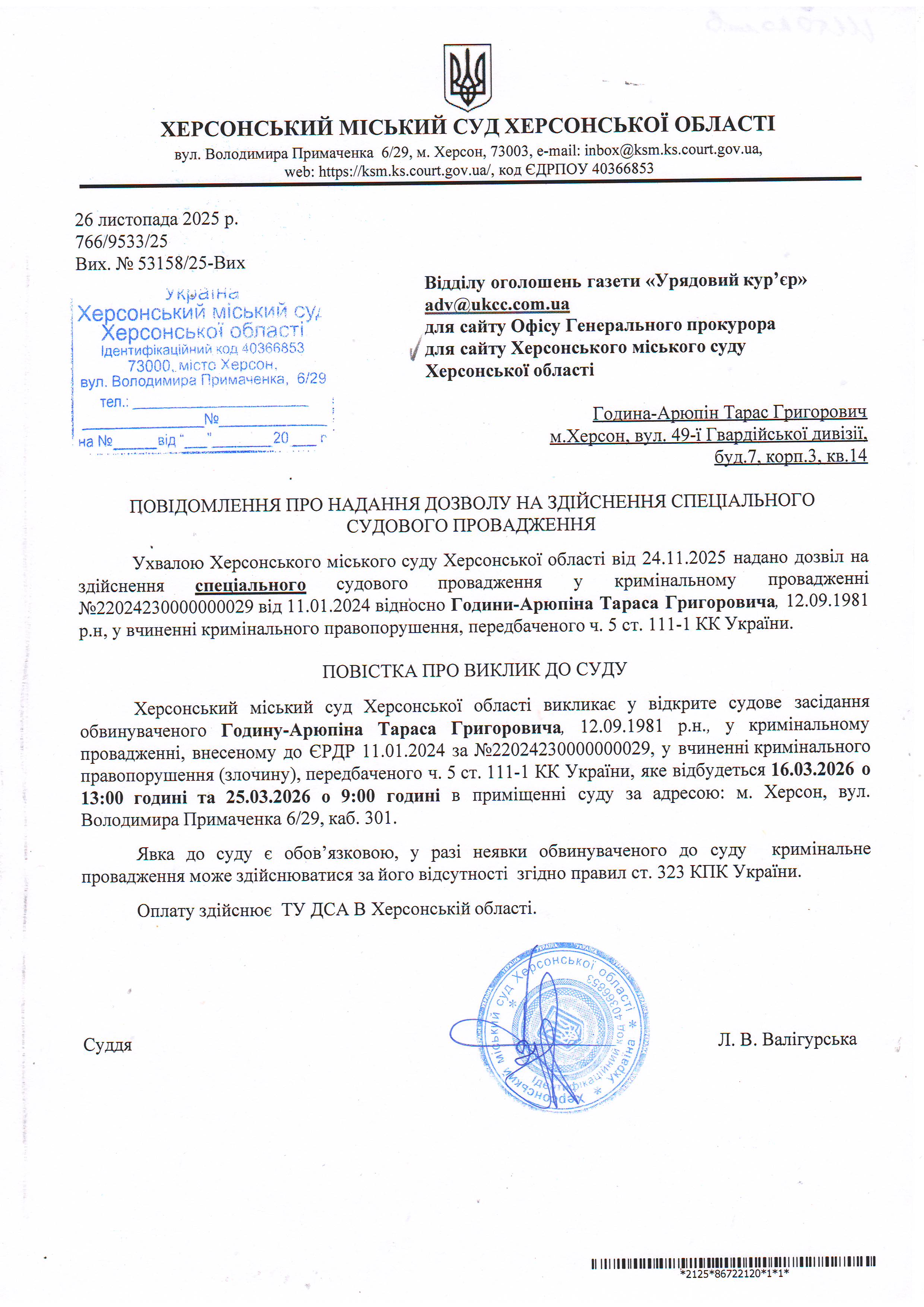 Оголошення про виклик особи в суд та повідомлення про судове рішення