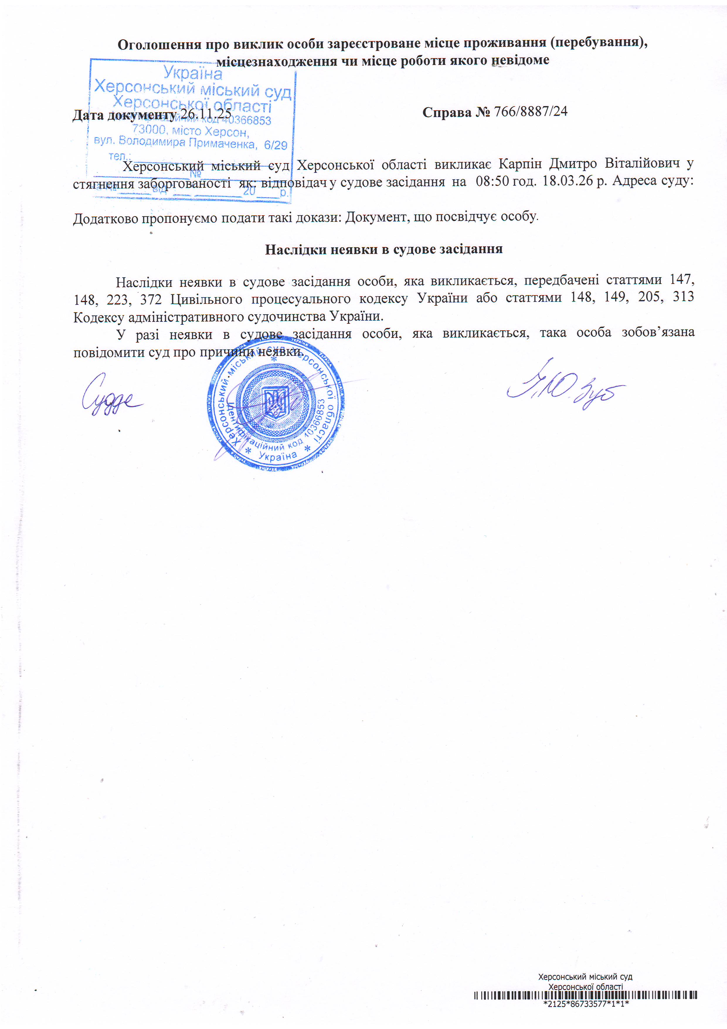 ОГОЛОШЕННЯ ПРО ВИКЛИК ДО СУДУ