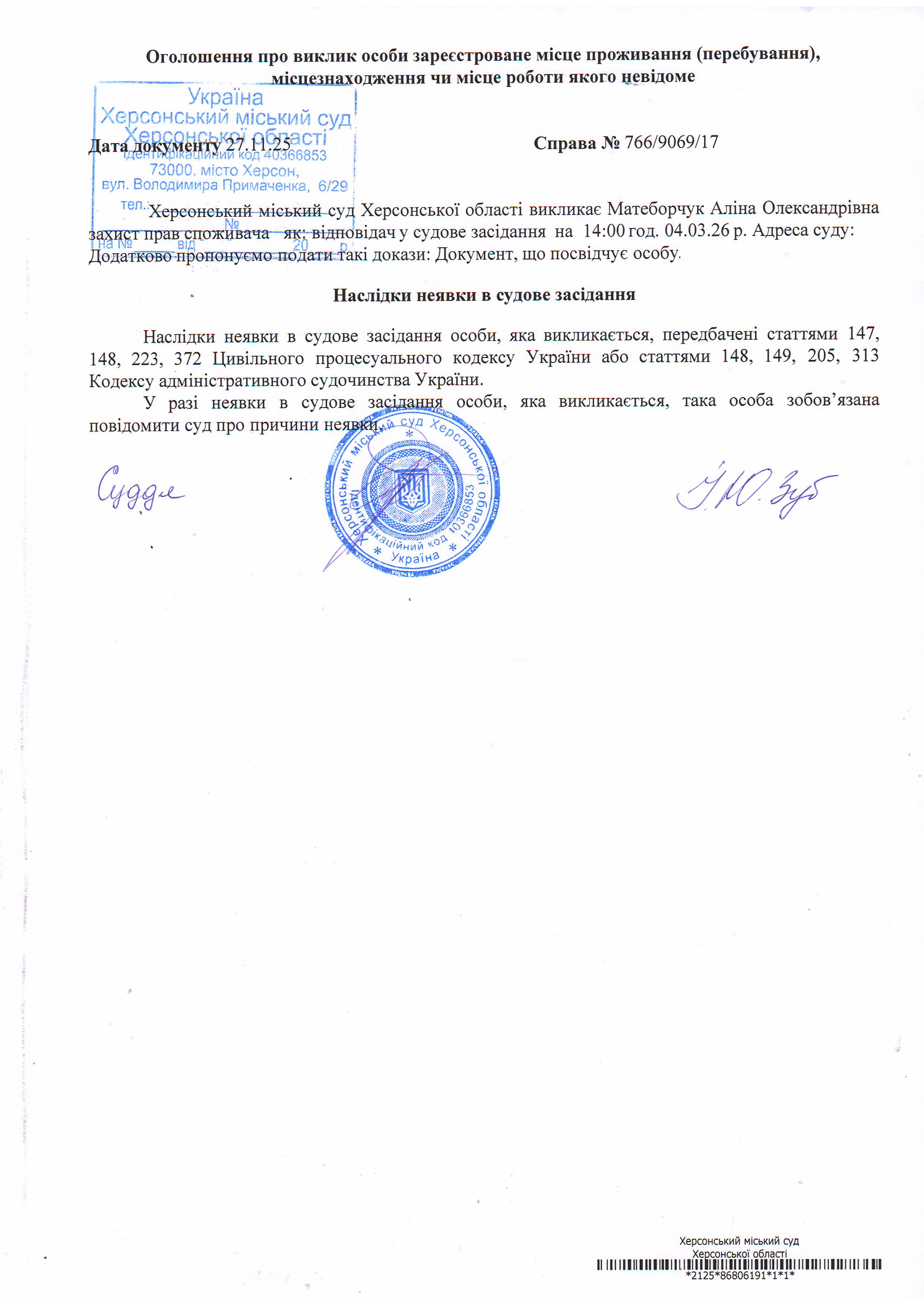 Оголошення про виклик особи в суд та повідомлення про судове рішення