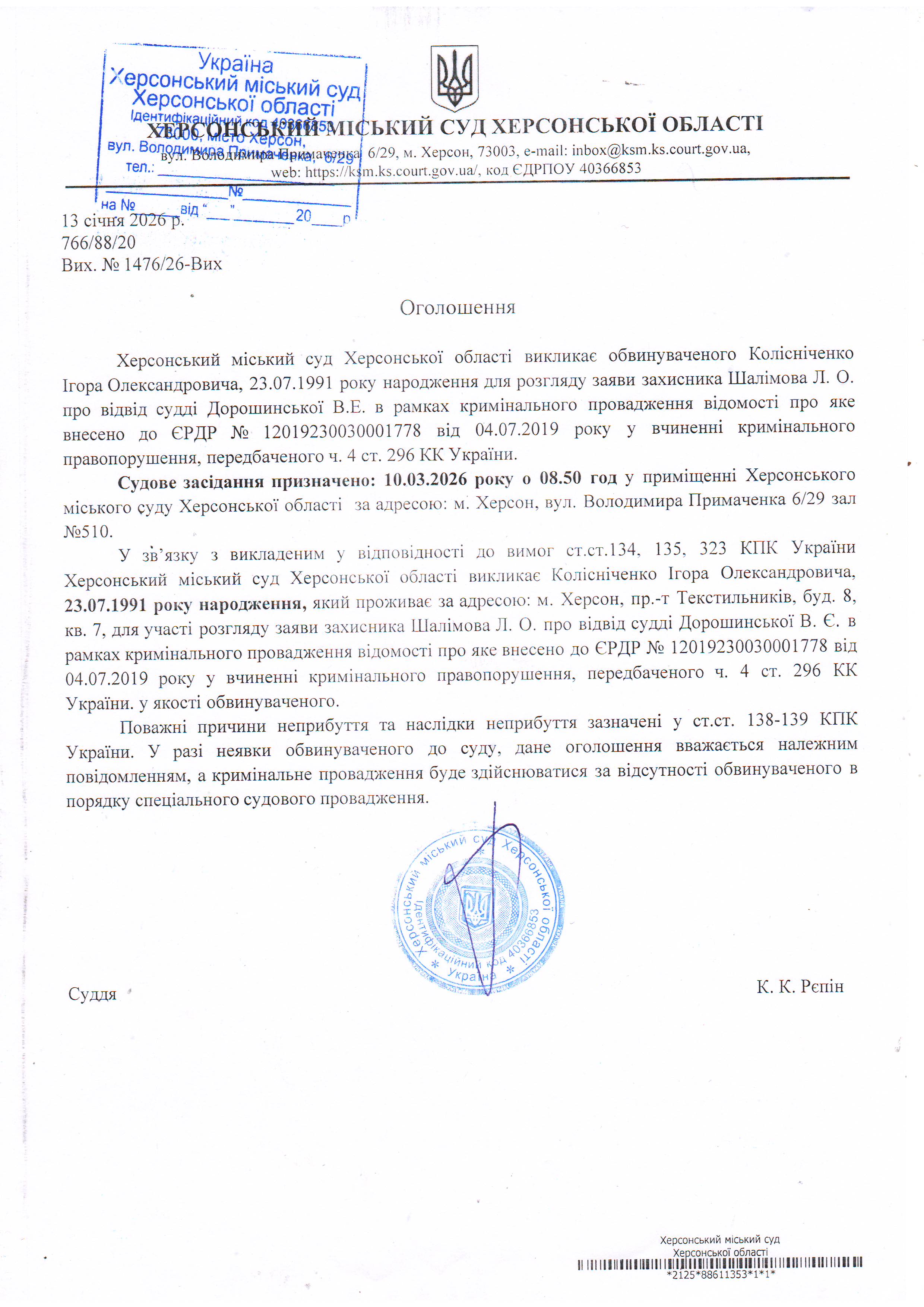 ОГОЛОШЕННЯ ПРО ВИКЛИК ДО СУДУ