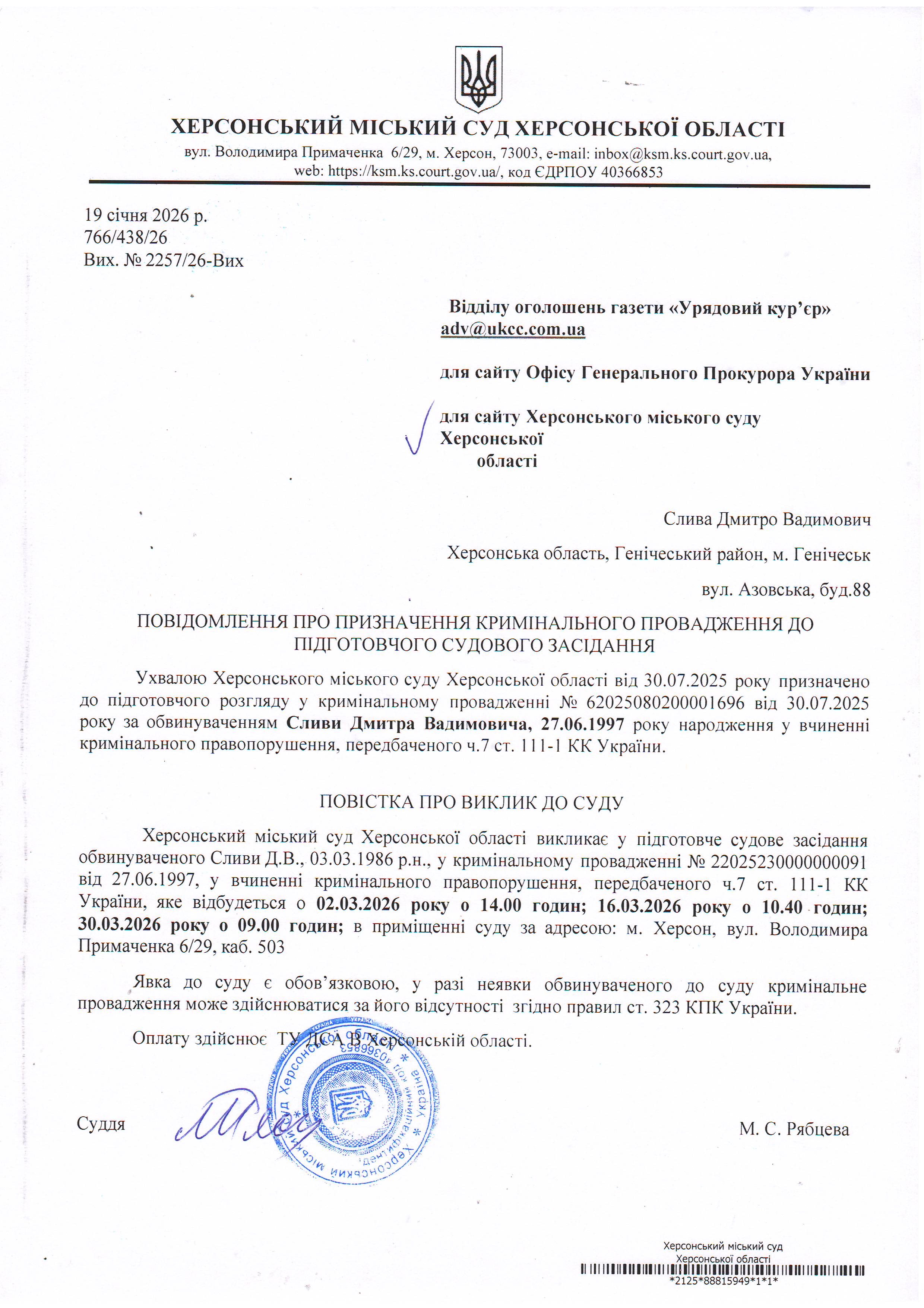 Оголошення про виклик особи в суд та повідомлення про судове рішення
