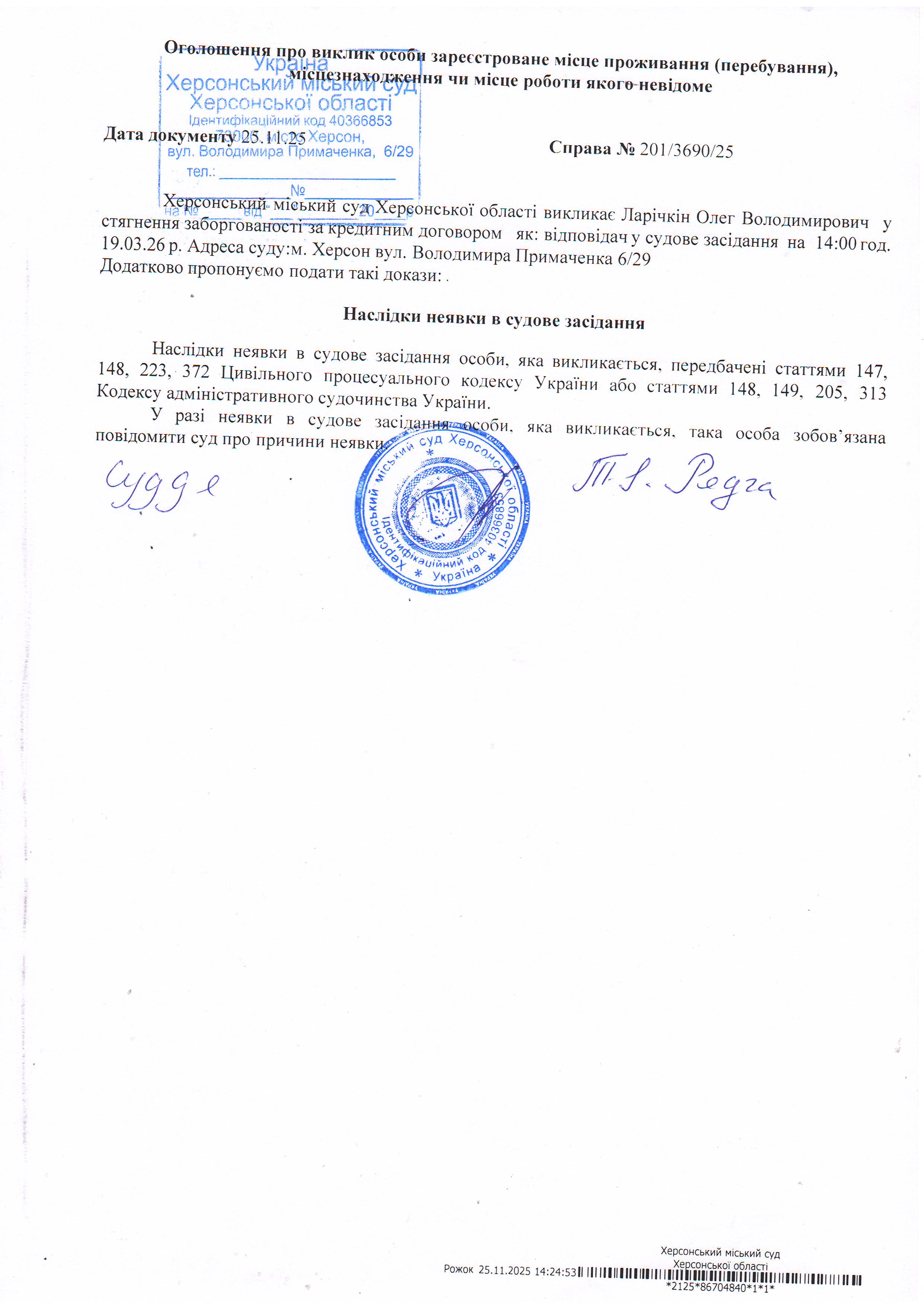ОГОЛОШЕННЯ ПРО ВИКЛИК ДО СУДУ