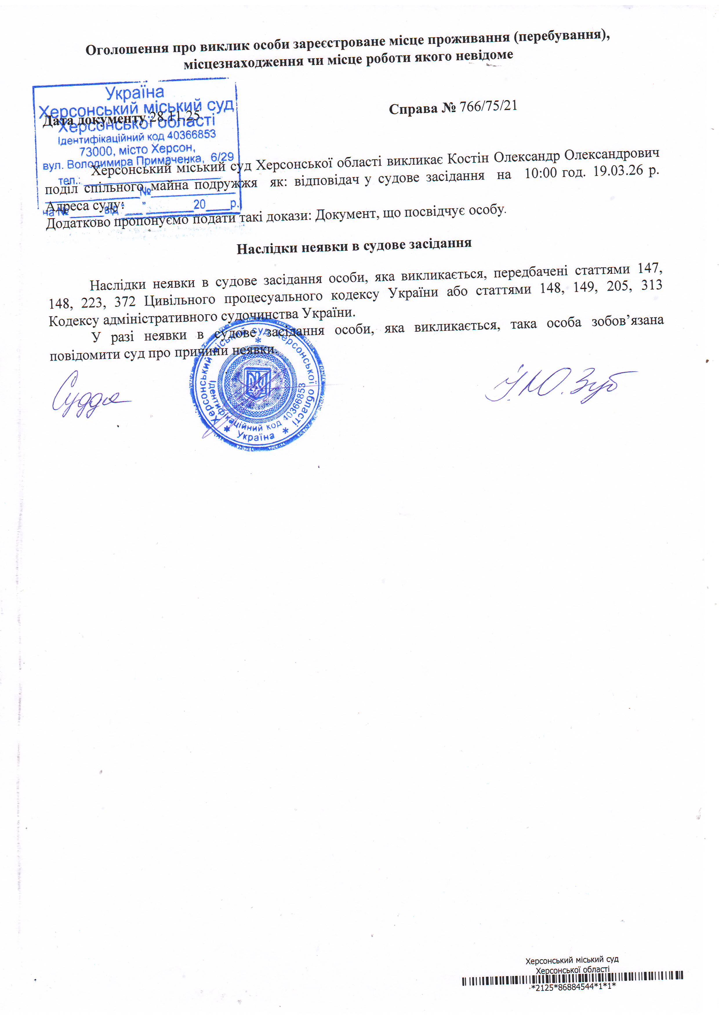 ОГОЛОШЕННЯ ПРО ВИКЛИК ДО СУДУ