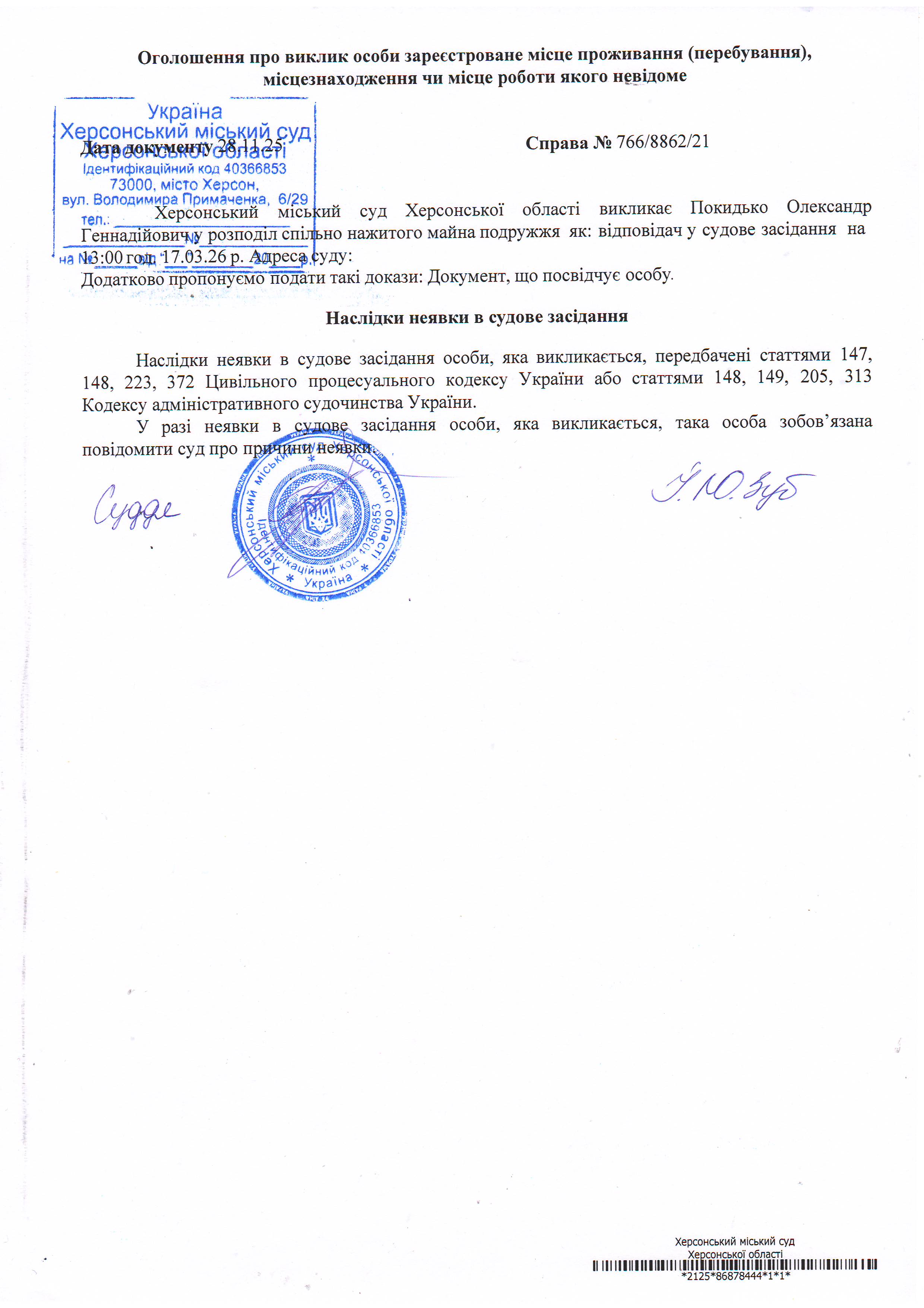 ОГОЛОШЕННЯ ПРО ВИКЛИК ДО СУДУ