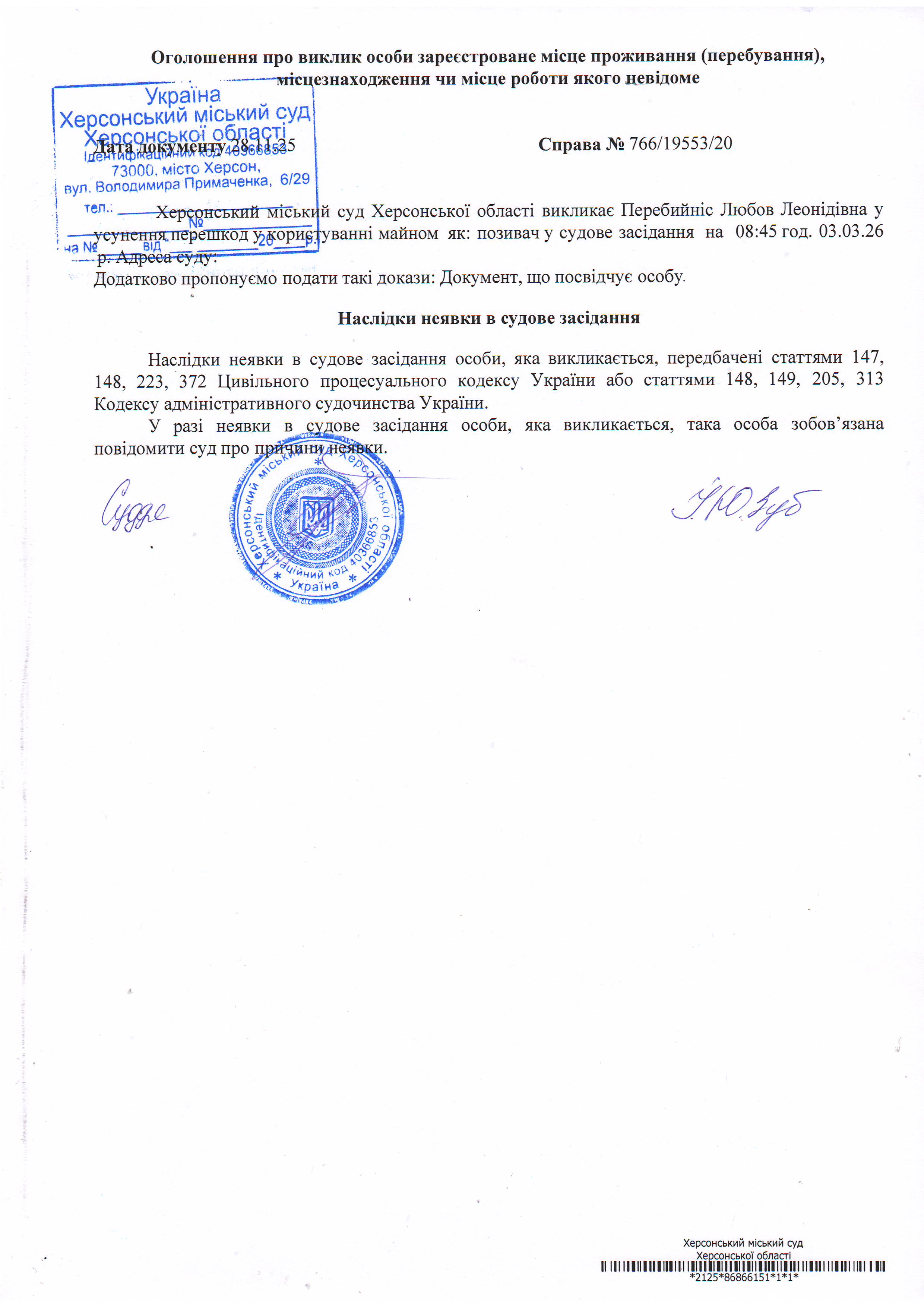 ОГОЛОШЕННЯ ПРО ВИКЛИК ДО СУДУ