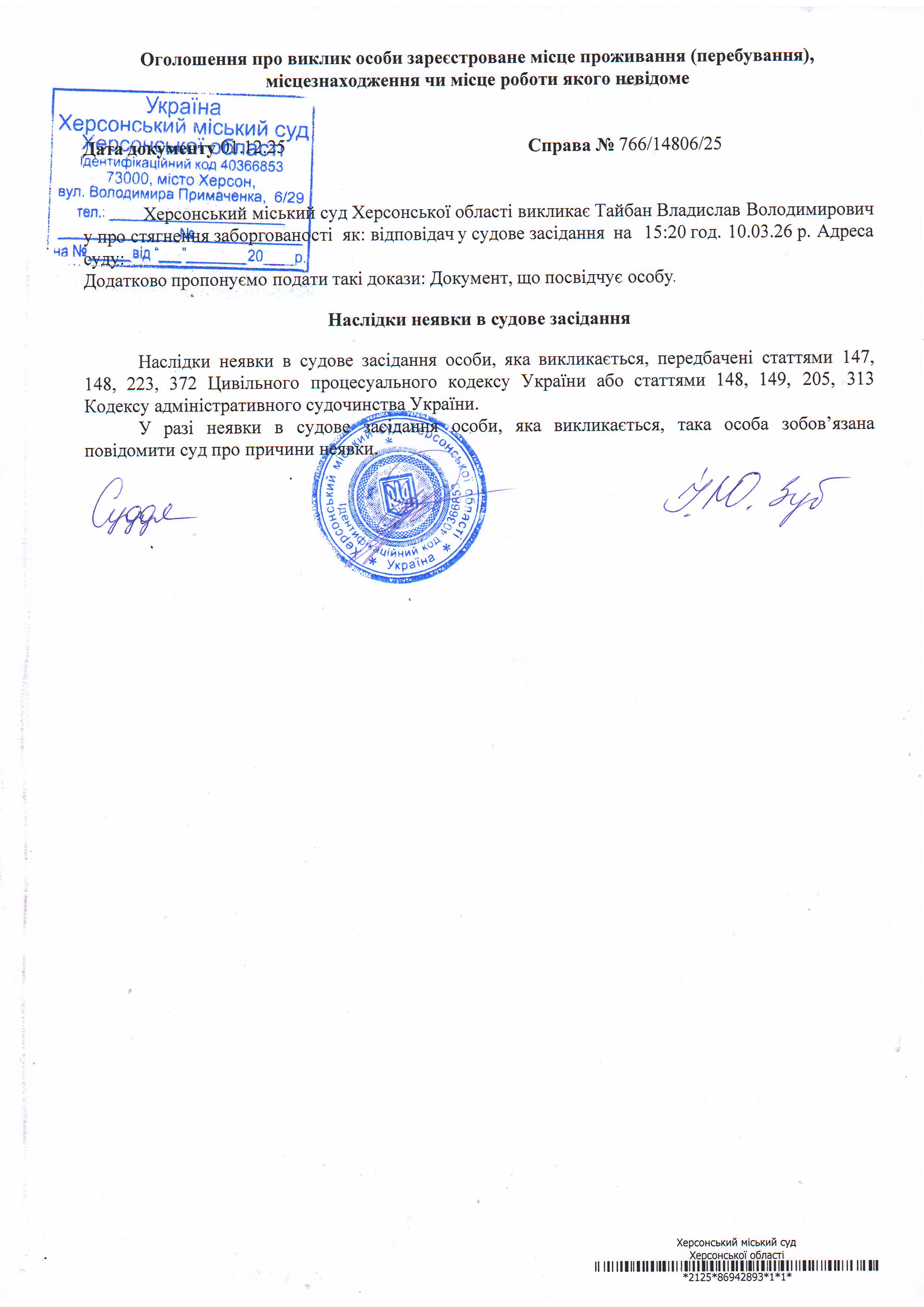 ОГОЛОШЕННЯ ПРО ВИКЛИК ДО СУДУ