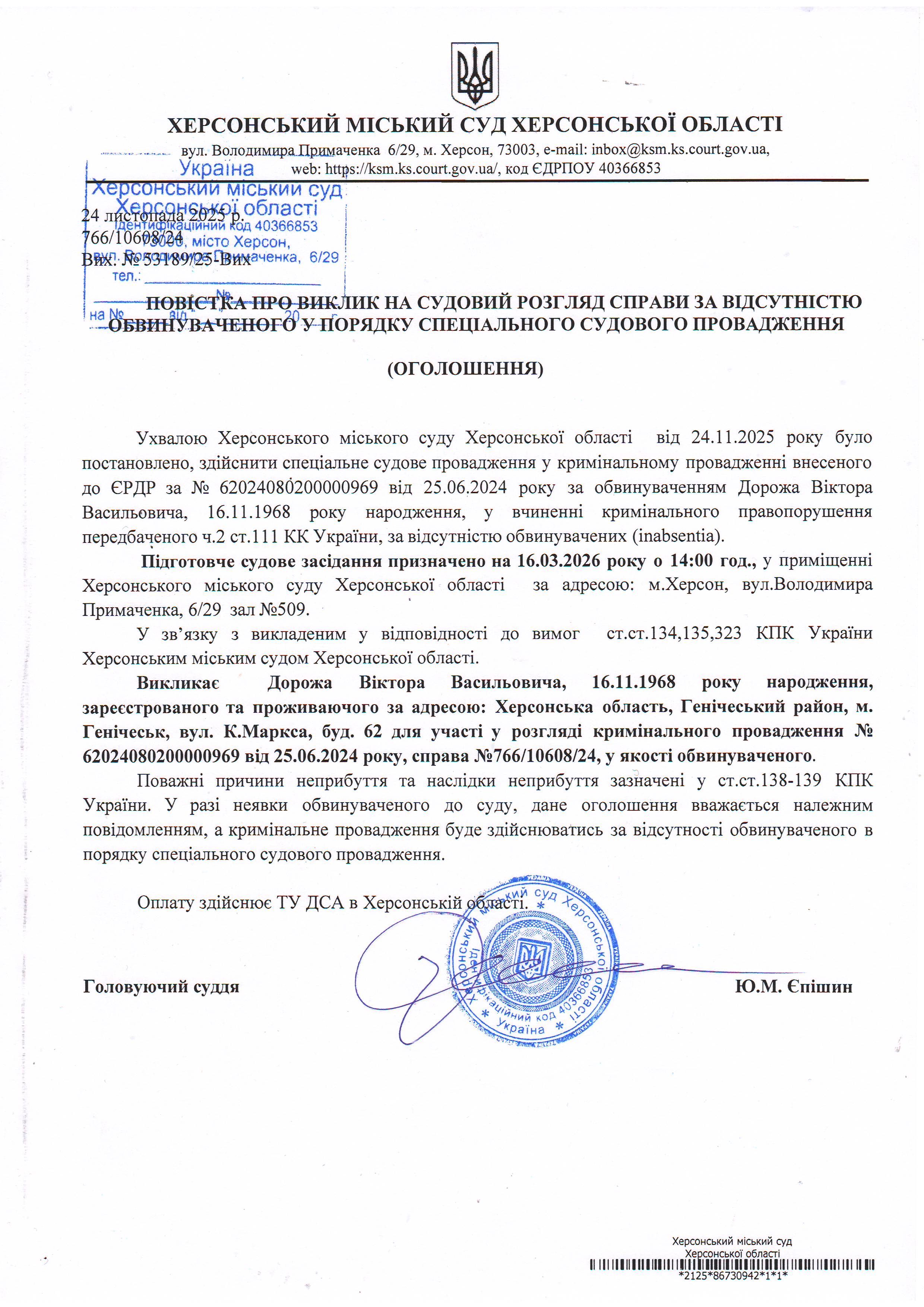 ОГОЛОШЕННЯ ПРО ВИКЛИК ДО СУДУ
