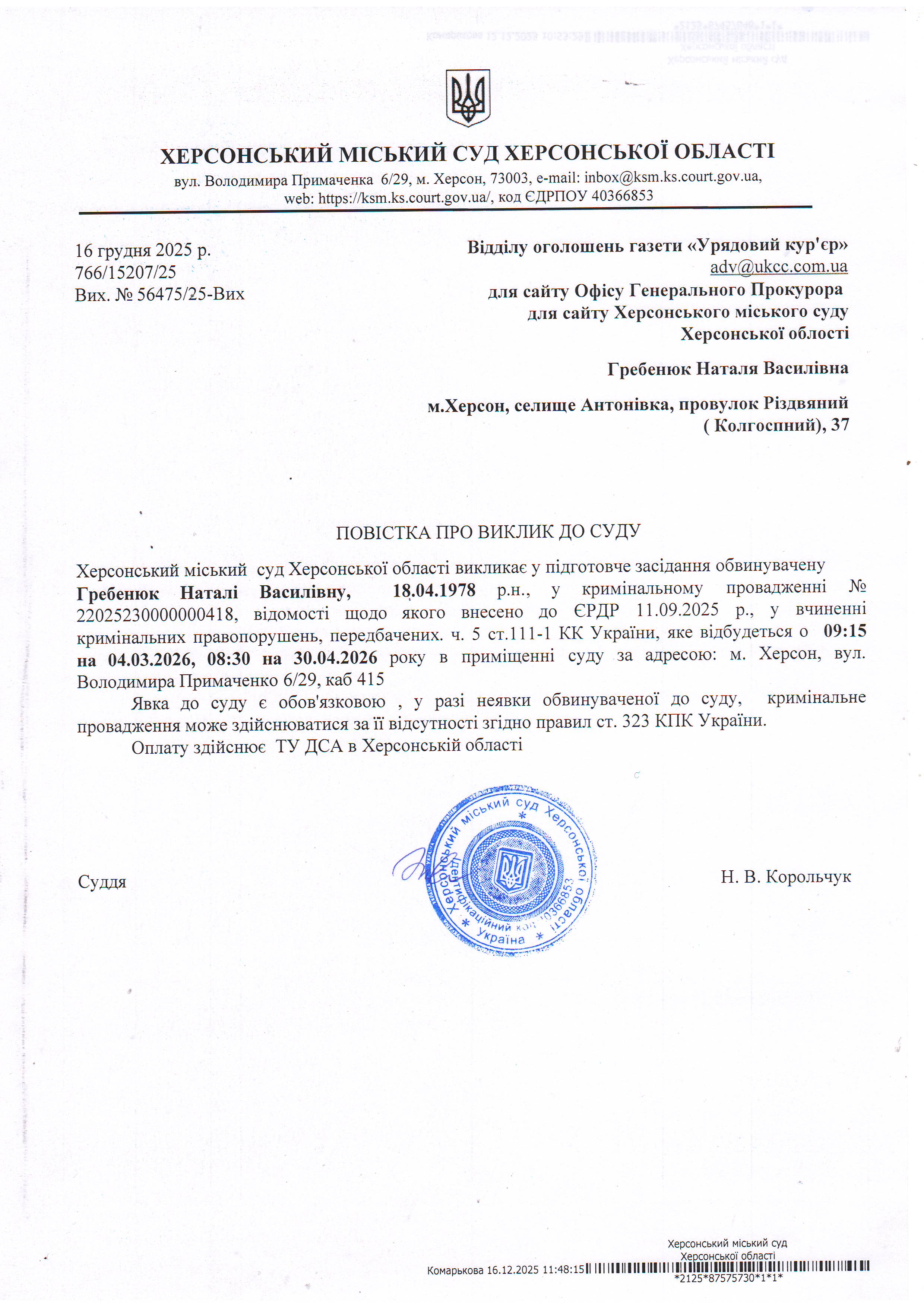 ОГОЛОШЕННЯ ПРО ВИКЛИК ДО СУДУ