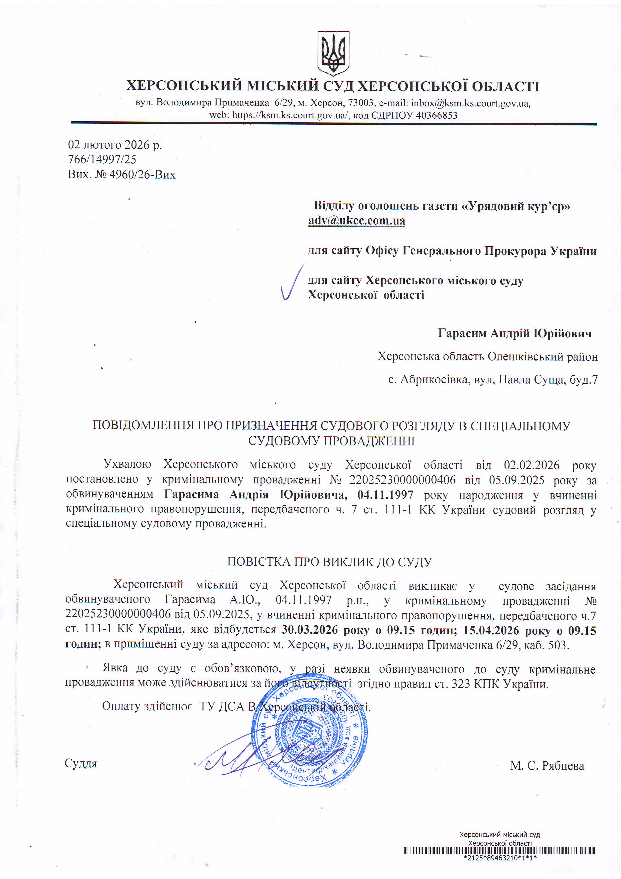 Оголошення про виклик особи в суд та повідомлення про судове рішення